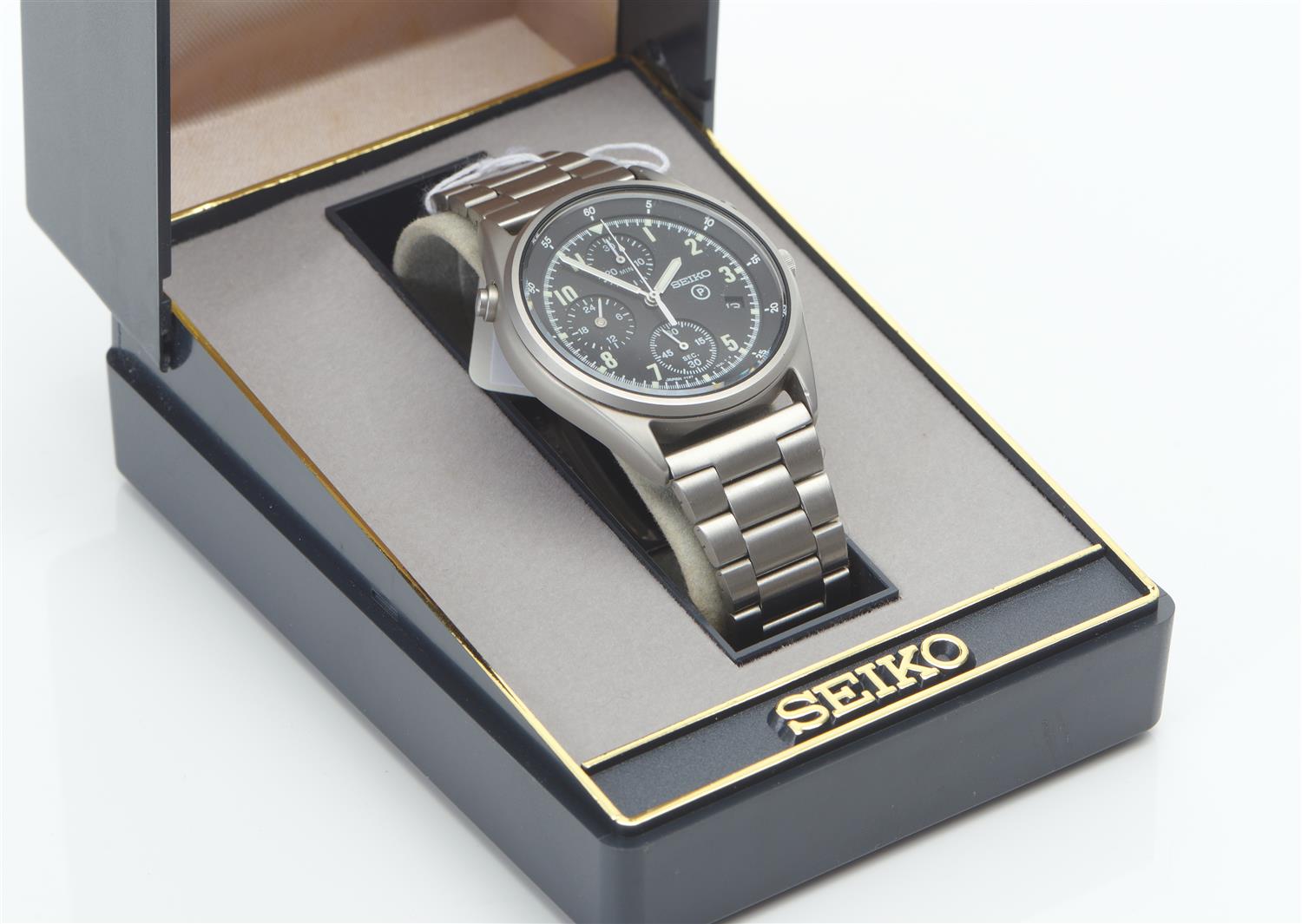 A SEIKO MILITARY CHRONOGRAPH QUARTZ WRISTWATCH TO STAINLESS STEEL CASE AND BANDS, ADDITIONAL LINKS, BOXED WITH PAPERS