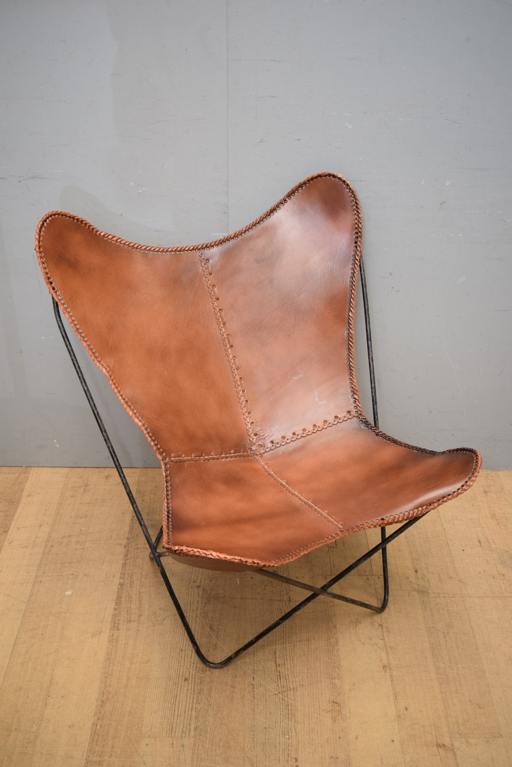 A MID-CENTURY LEATHER SLING BUTTERFLY CHAIR ( 91H X 74W X 84D CM) (LEONARD JOEL DELIVERY SIZE: MEDIUM)