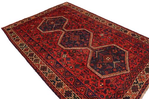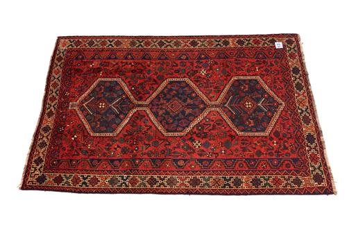 A TRIBAL PERSIAN SHIRAZ RUG. 100% wool. Hand-knotted village weave from the Fars province with tribal design of triple bold hooked medallions containing floral & "tree of life" patterns & peacock forms in a red field of secondary floral patterns, birds, horse & camel forms. Geometric-patterned border. In excellent condition. Certificate of authenticity included. SIZE:252X175 ORIGIN: PERSIA RRP: $3500