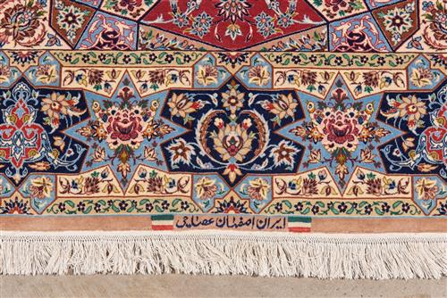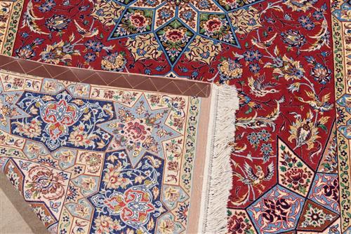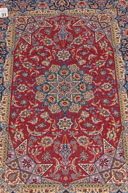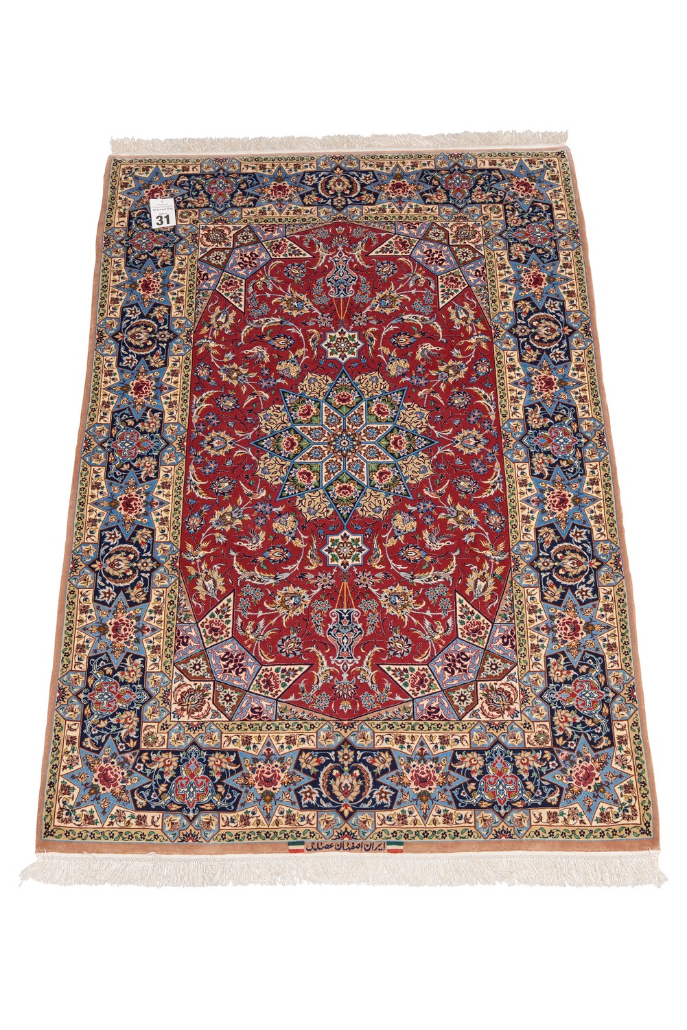 A STUNNING WOOL & SILK PERSIAN ISFAHAN CARPET. Silk foundation. Wool pile heavily inter-knotted with silk inlays. Finely Hand-knotted "ASACHI" Atelier weave of 700,000 knots per square meter. Rare Isfahan design of Star-shaped floral medallion ccontaining rose motifs & quartered corner medallions set within a crimson field of 16th Century Shah Abbassi palmettes, floral sprays, Saz leaves & birds of pardise. Mosaic patterned border of palmettes & Gulfarang rose motifs. Ex-gallery exhibited. Brand new & in pristine condition. Certificate of authenticity included. SIZE: 213X142 ORIGIN: PERSIA RRP: $13500