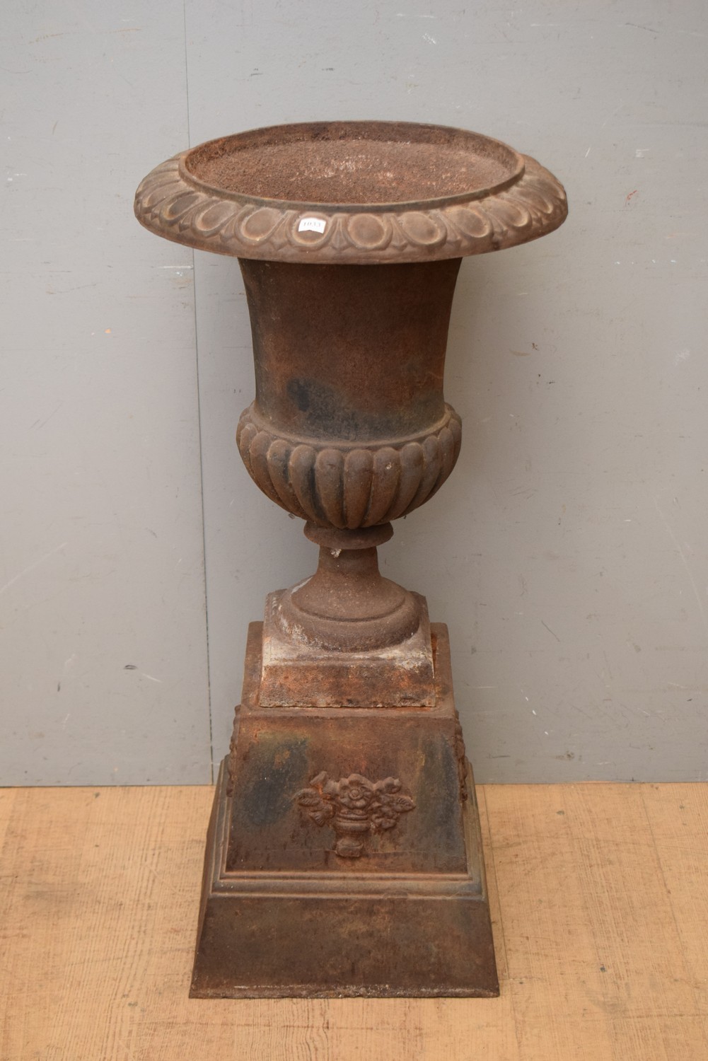A CLASSICAL STYLE CAST IRON URN ON BASE (96H X 47W CM) (PLEASE NOTE THIS HEAVY ITEM MUST BE REMOVED BY CARRIERS AT THE CUSTOMER'S EXPENSE. LEONARD JOEL STAFF CANNOT ASSIST CARRYING THIS ITEM) (X-LARGE ITEM)