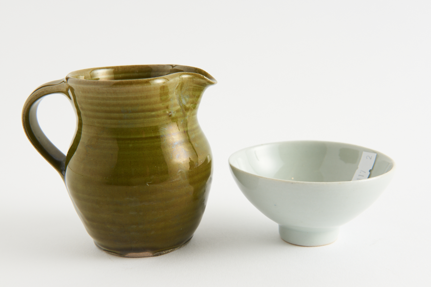 IVAN MCMEEKIN, GREEN GLAZED STONE WARE JUG AND A CELADON GLAZED STONE WARE BOWL, THE JUG 10 CM HIGH, LEONARD JOEL LOCAL DELIVERY SIZE: SMALL