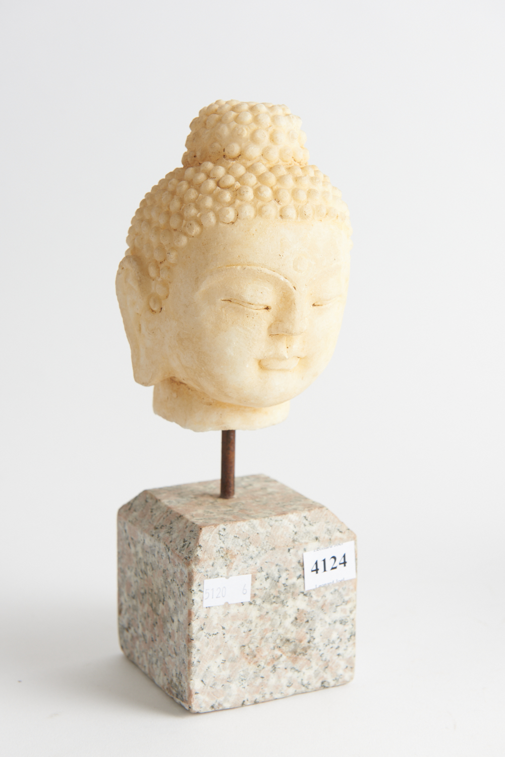 A MARBLE HEAD OF BUDDHA ON STAND, 26 CM HIGH, LEONARD JOEL LOCAL DELIVERY SIZE: SMALL