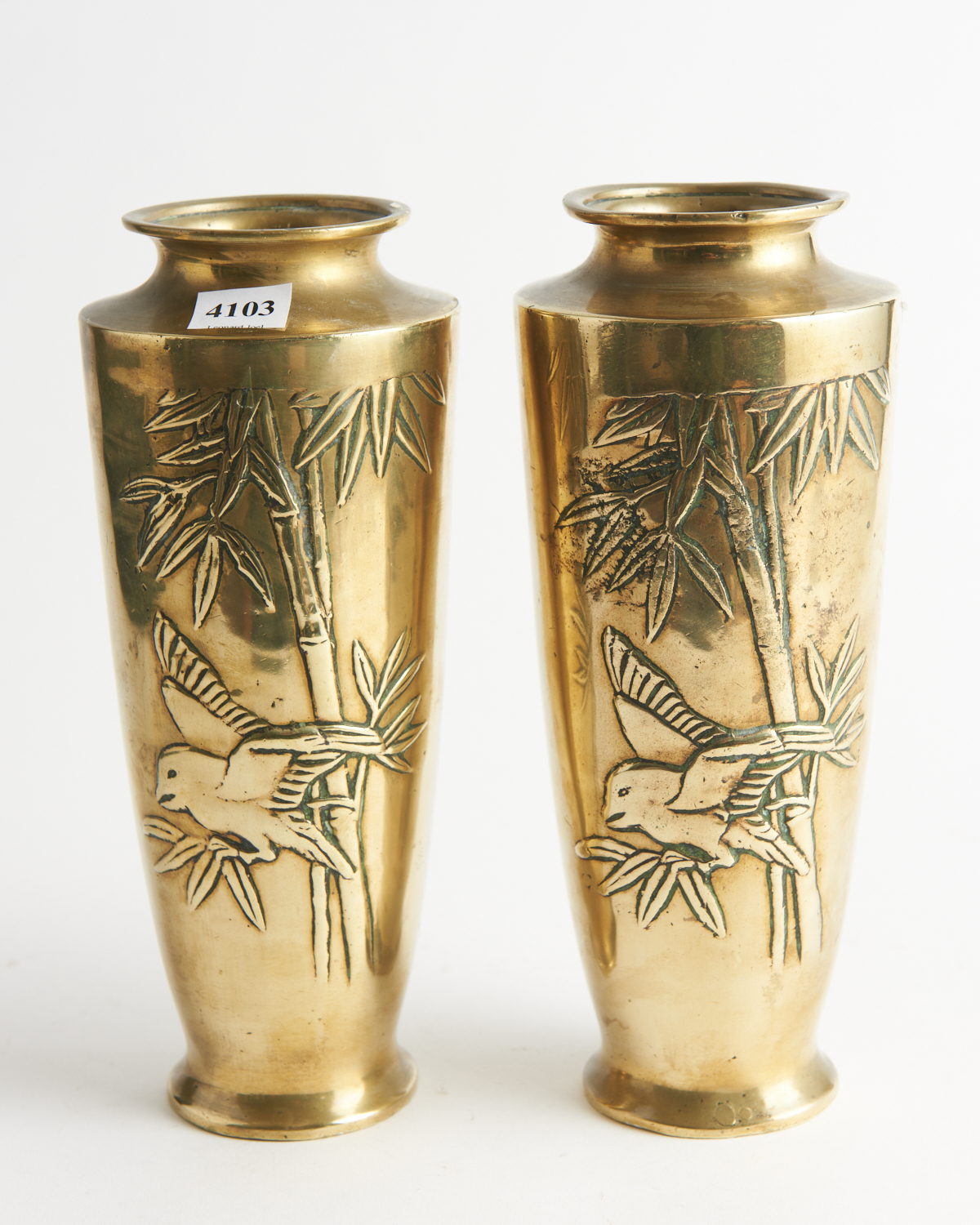 A PAIR OF LATE 19TH CENTURY BRASS VASES, 25.5 CM HIGH, LEONARD JOEL LOCAL DELIVERY SIZE: SMALL