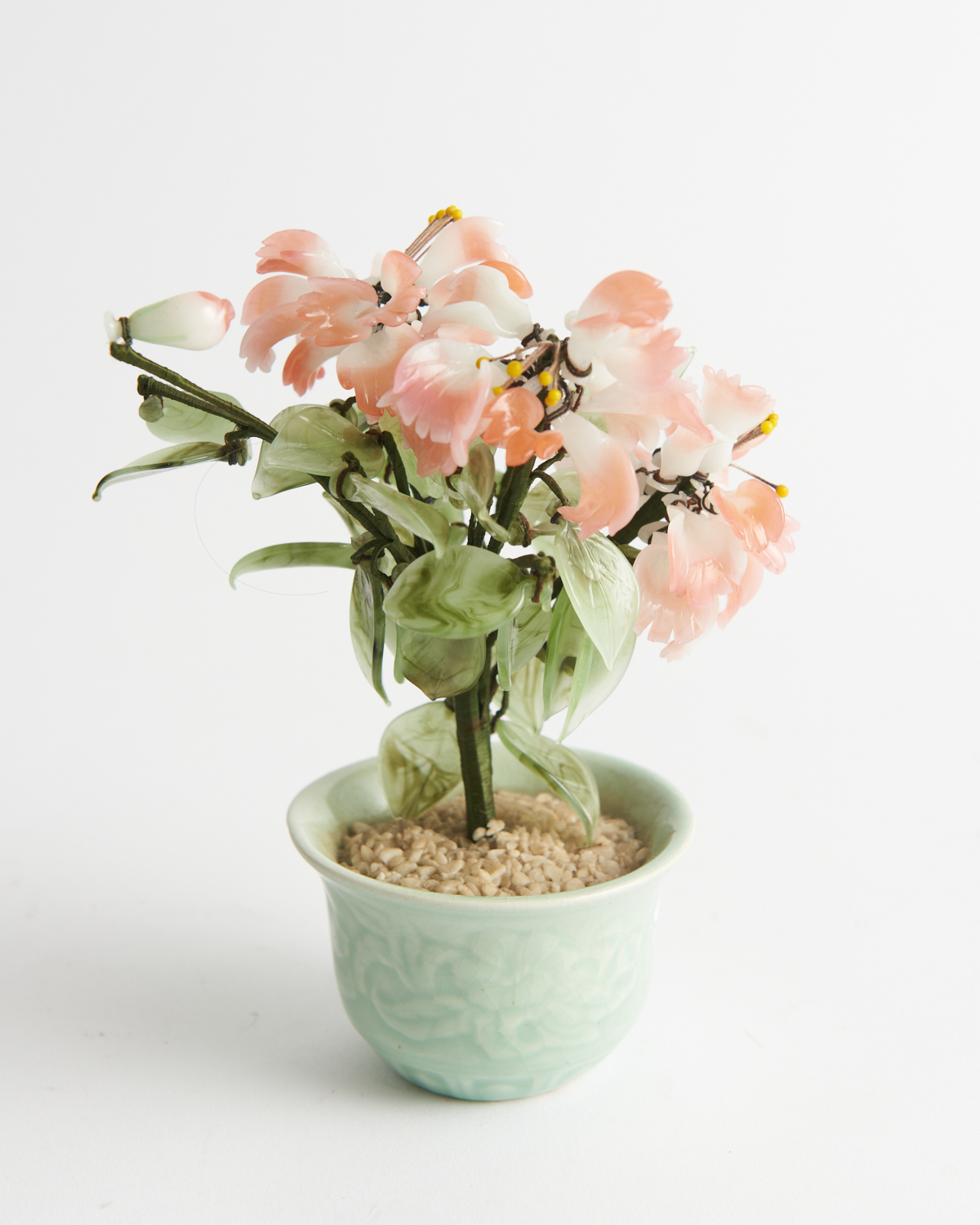 A CARVED STONE FLORAL GROUP IN A SMALL POT, 18 CM HIGH, LEONARD JOEL LOCAL DELIVERY SIZE: SMALL