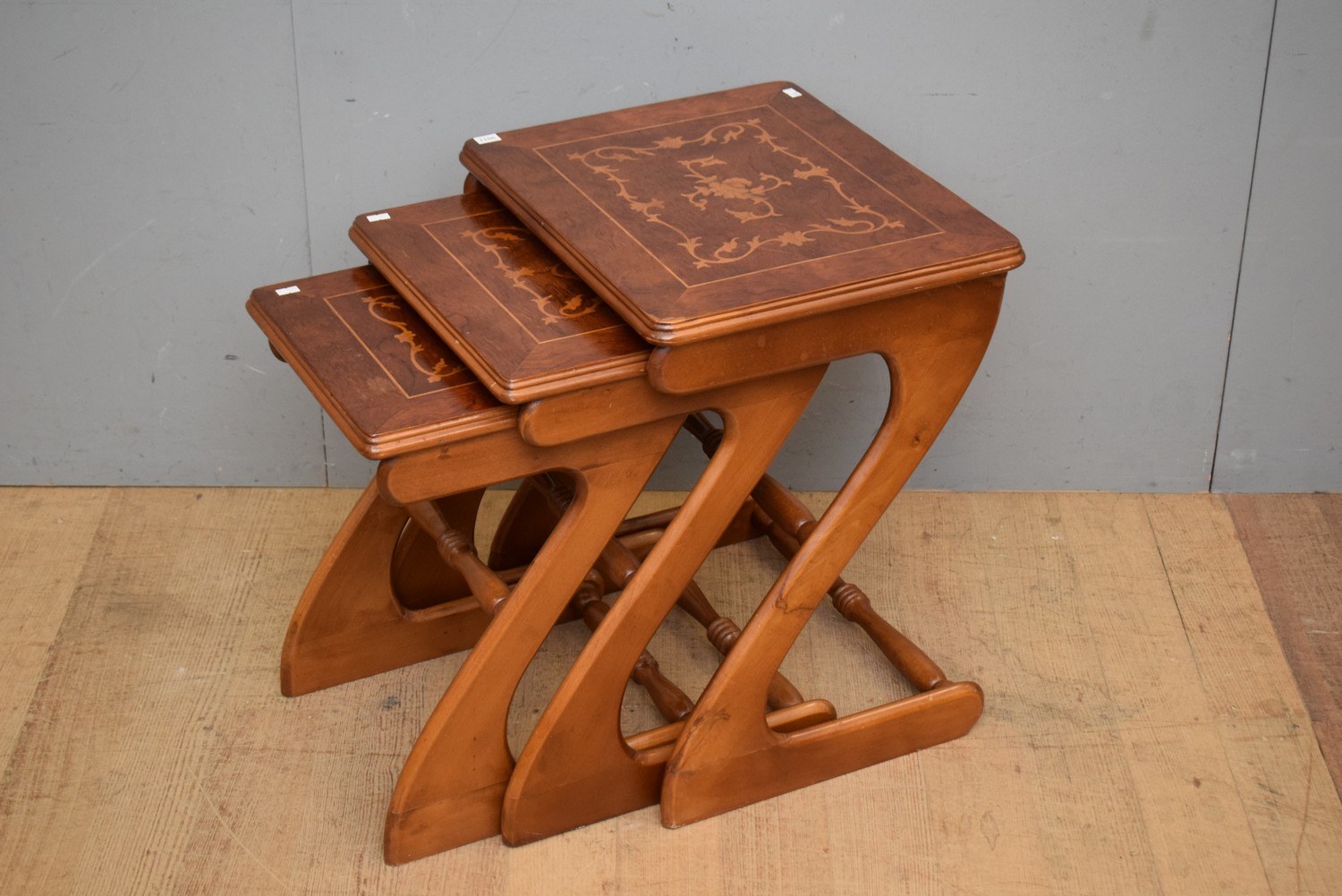 A NEST OF DECORATIVELY INLAID TABLES (A/F) (H58 X W50 X D42 CM) (LEONARD JOEL DELIVERY SIZE: SMALL)