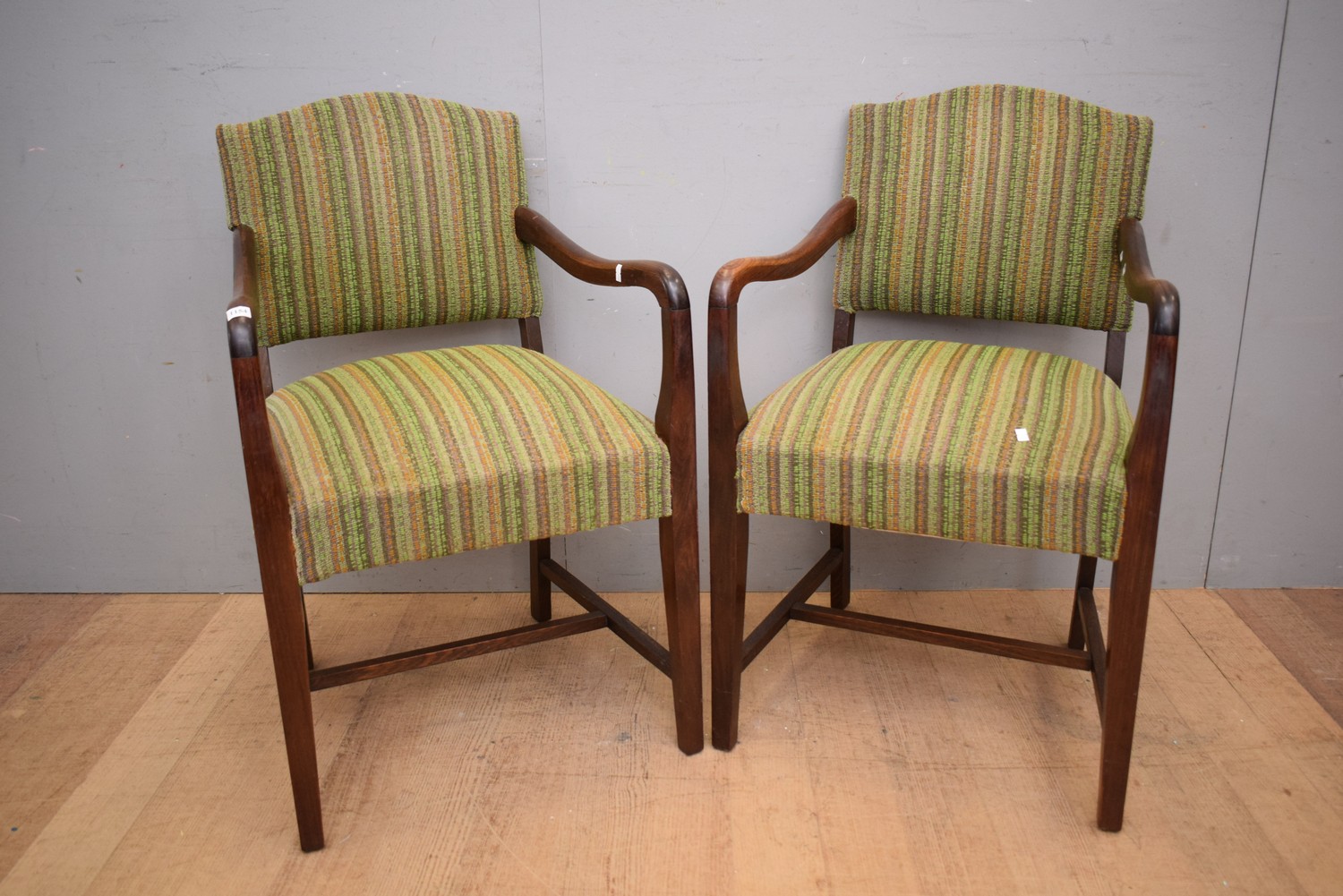A PAIR OF OAK UPHOLSTERED ARCMHAIRS ( 86H X 54W X 59D CM) (LEONARD JOEL DELIVERY SIZE: MEDIUM)