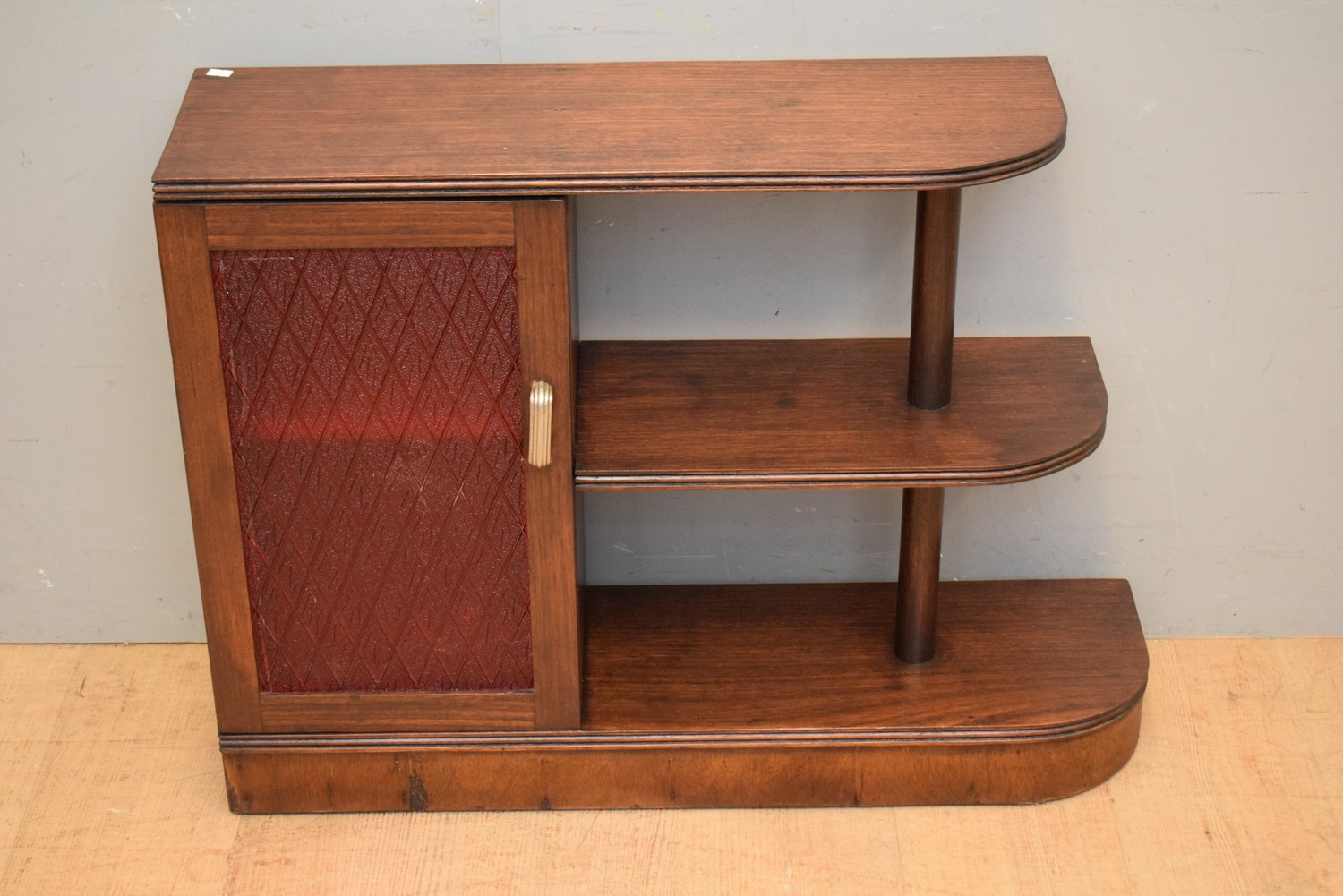 AN OAK ART DECO THREE TIER SHELF WITH SINGLE DOOR (A/F - DAMAGE TO VENEER) (69H X 91W X 25D CM) (LEONARD JOEL DELIVERY SIZE: MEDIUM)