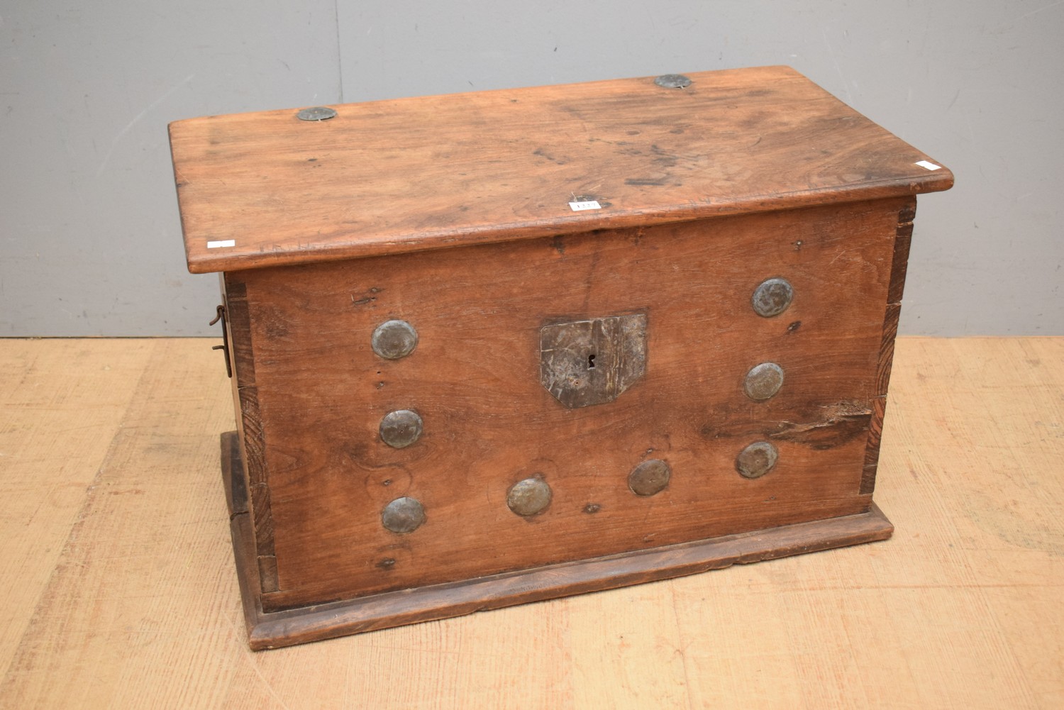 A RUSTIC FLIP TOP TRUNK WITH METAL STUDDING (42H x 71W x 38D CM) (LEONARD JOEL DELIVERY SIZE: SMALL)