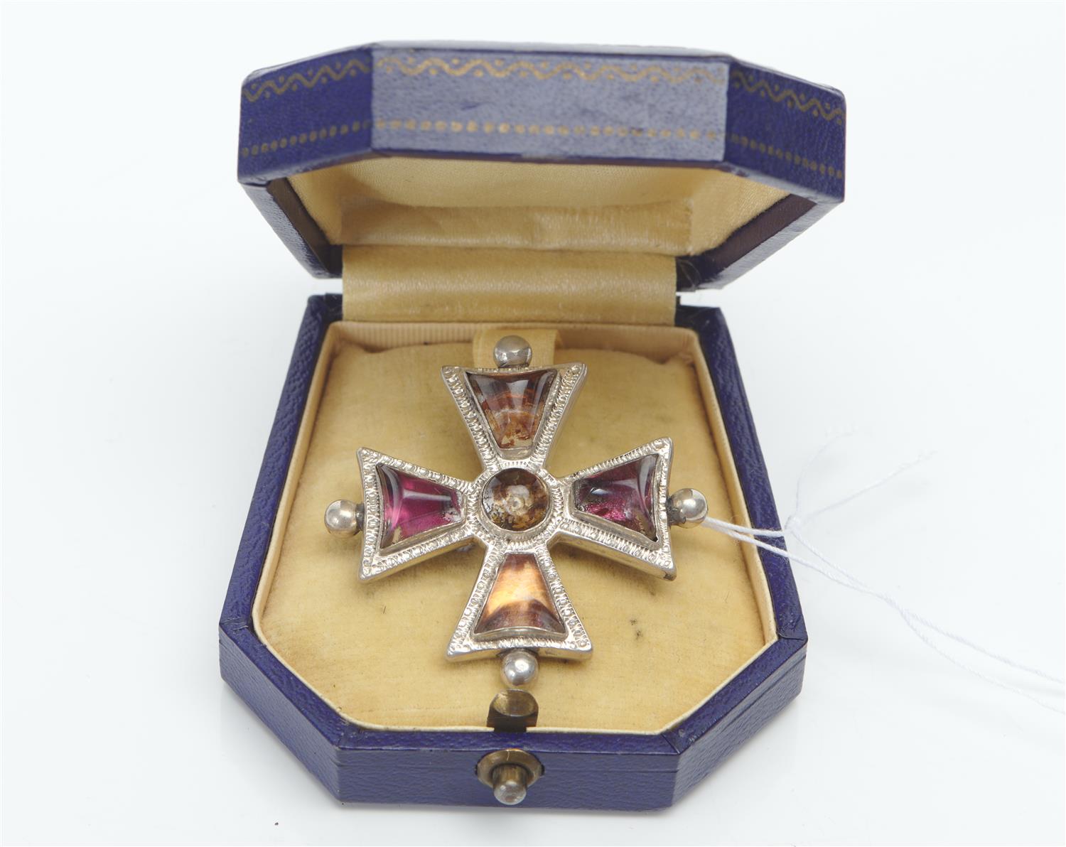 A VICTORIAN MALTESE CROSS BROOCH IN STERLING SILVER, SET WITH FOIL BACKED ROCK CRYSTAL, LENGTH 40MM