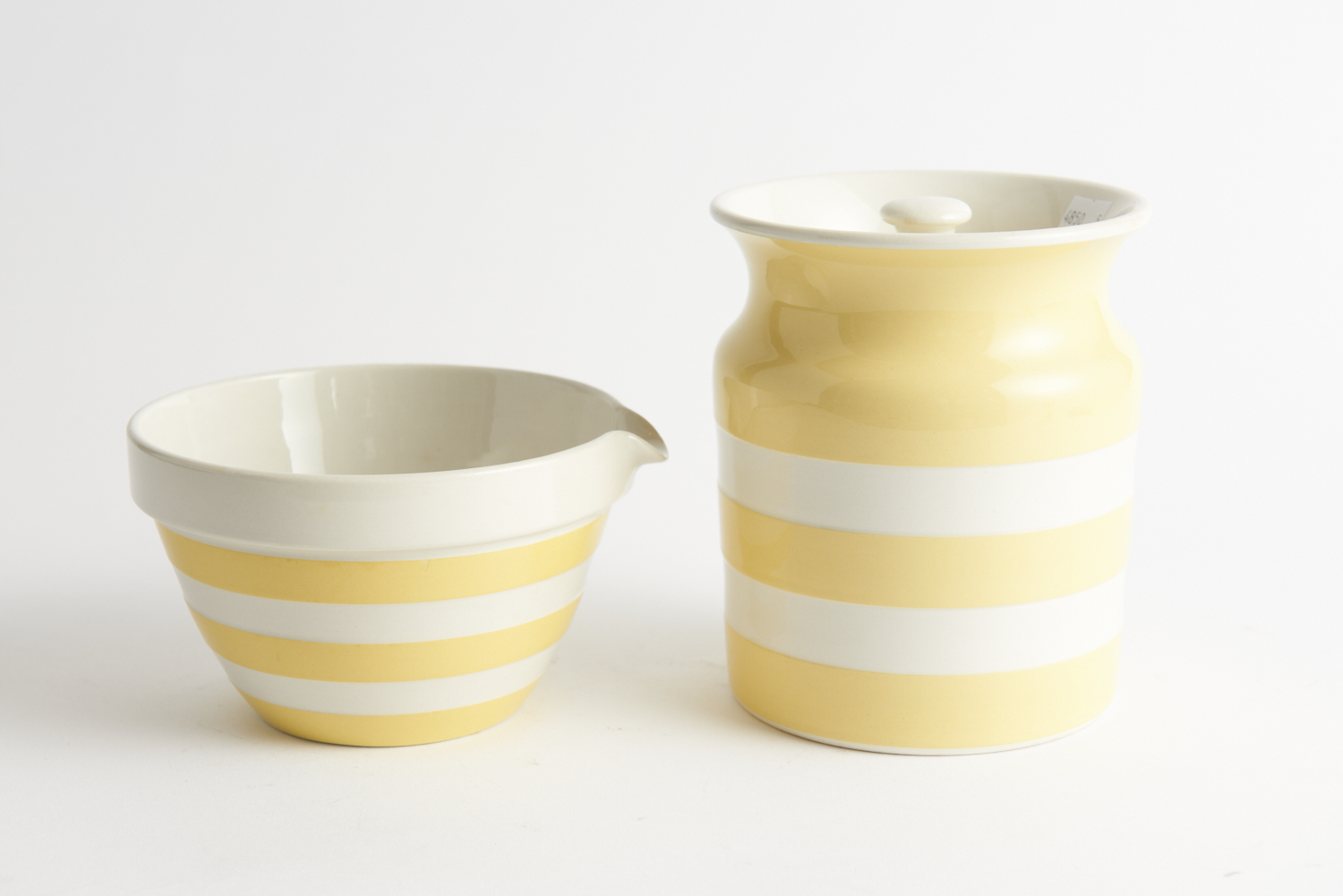 A T G GREENE STRIPED WHITE AND YELLOW CORNISH KITCHEN WARE CANNISTER AND MIXING BOWL, LEONARD JOEL LOCAL DELIVERY SIZE: SMALL