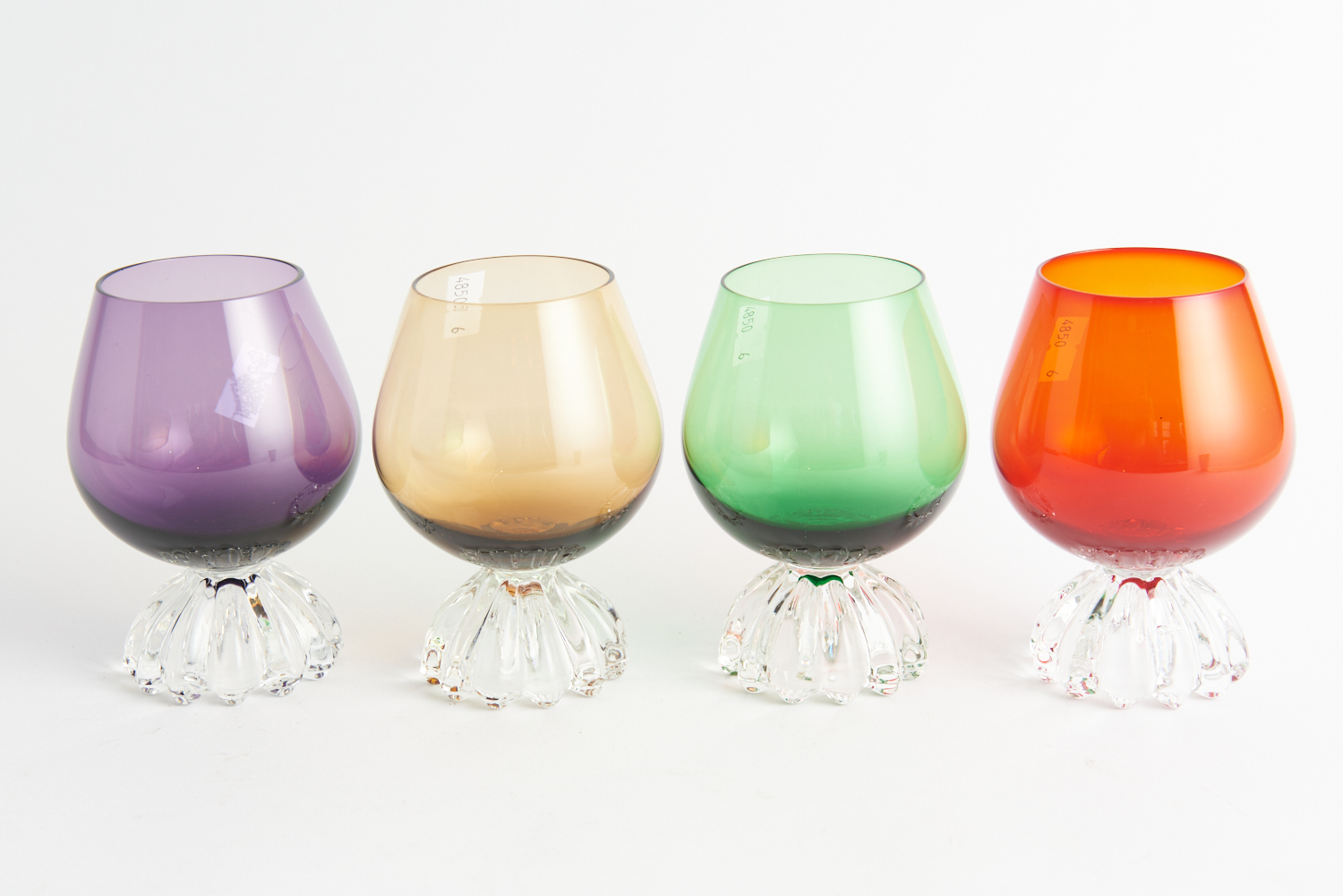 FOUR RETRO HARLEQUIN GLASSES WITH HEAVY CLEAR GLASS ORGANIC FORM BASES, LEONARD JOEL LOCAL DELIVERY SIZE: SMALL