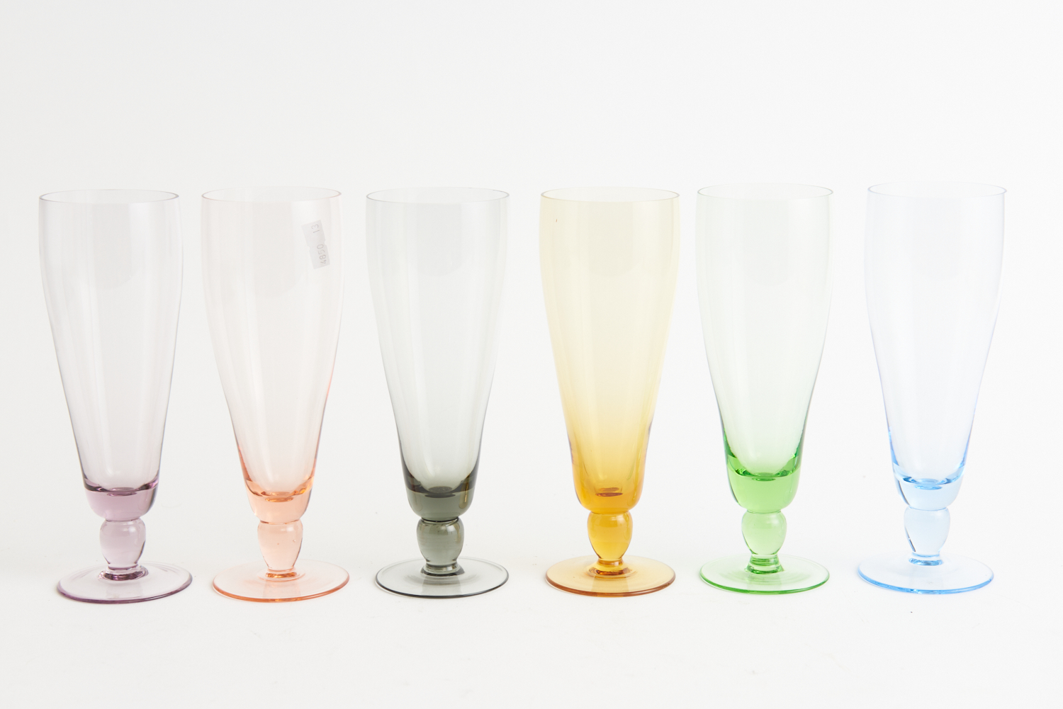 A SET OF SIX RETRO HARLEQUIN TALL FLUTED CHAMPAGNE GLASSES, LEONARD JOEL LOCAL DELIVERY SIZE: SMALL