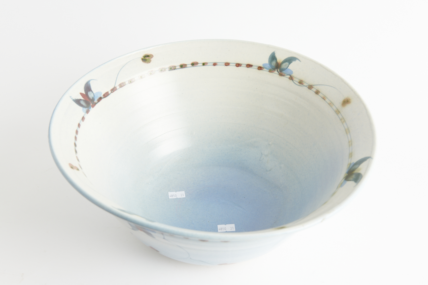 A LARGE STUDIO POTTERY BOWL WITH FLORAL DETAILING, 38 CM DIAMETER, LEONARD JOEL LOCAL DELIVERY SIZE: SMALL