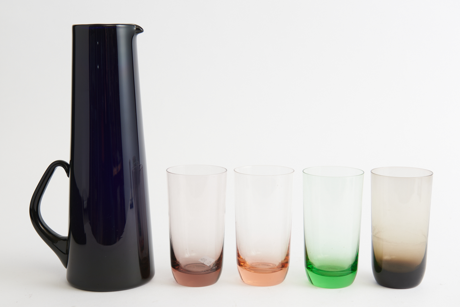 A SET OF FOUR RETRO HARLEQUIN TUMBLERS WITH A MATCHED JUG, LEONARD JOEL LOCAL DELIVERY SIZE: SMALL