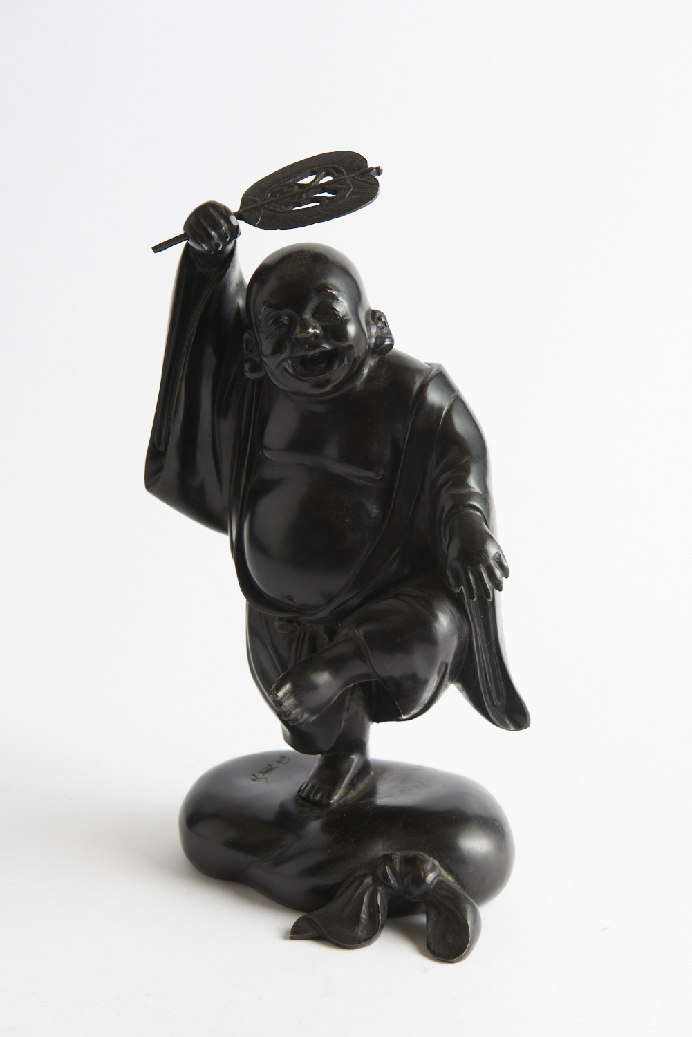 A SIGNED JAPANESE BRONZE FIGURE OF LUCKY BUDDHA ON MONEY BAG HOLDING FAN H.36CM, LEONARD JOEL LOCAL DELIVERY SIZE: SMALL