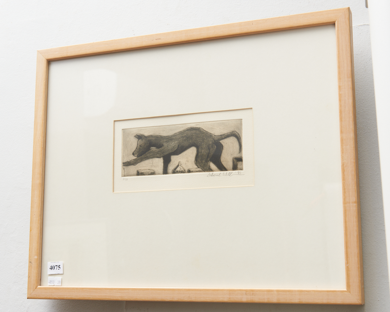 A FRAMED ETCHING OF A DOG BY DEBORAH WELLS 1993, 10 X 20 CM, LEONARD JOEL LOCAL DELIVERY SIZE: SMALL