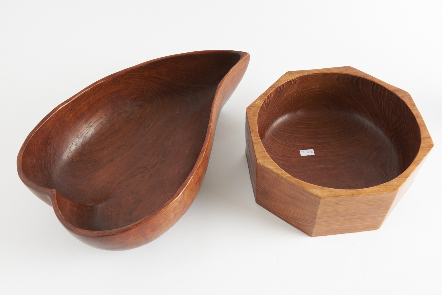 TWO RETRO TEAK BOWLS INCLUDING HEXAGONAL AND LEAF FORM, THE LARGEST 38 CM WIDE (IRREGULAR), LEONARD JOEL LOCAL DELIVERY SIZE: SMALL