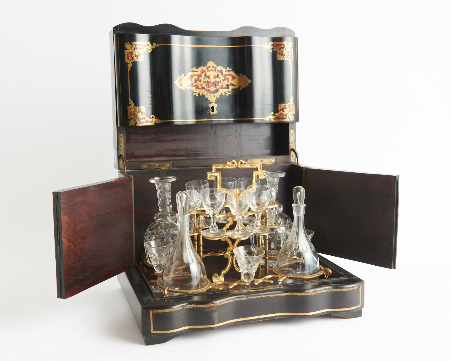 A FINE EBONISED AND BOULLE (INLAID BRASS AND TORTOISESHELL) DRINKS COMPENDIUM TANTALUS SET - UNMATCHED DECANTERS AND GLASSES (A/F), 34 CM WIDE, 27 CM HIGH, 24.5 CM DEPTH, LEONARD JOEL LOCAL DELIVERY SIZE: SMALL