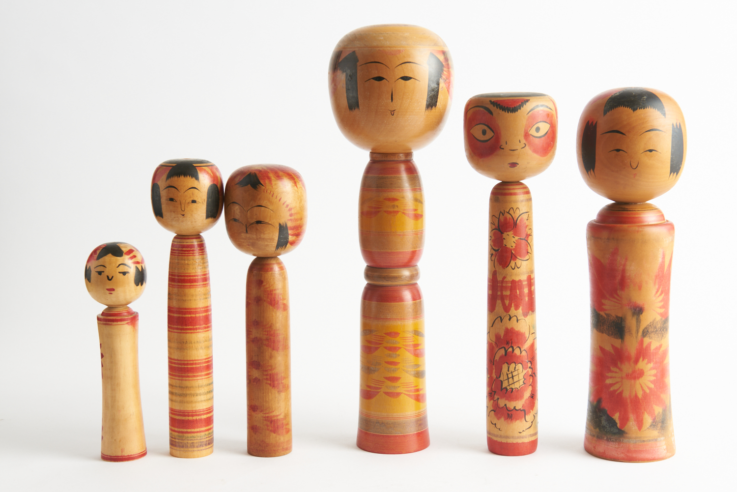 SIX VINTAGE JAPANESE HAND PAINTED WOODEN KOKESHI DOLLS, THE TALLEST 36 CM HIGH, LEONARD JOEL LOCAL DELIVERY SIZE: SMALL