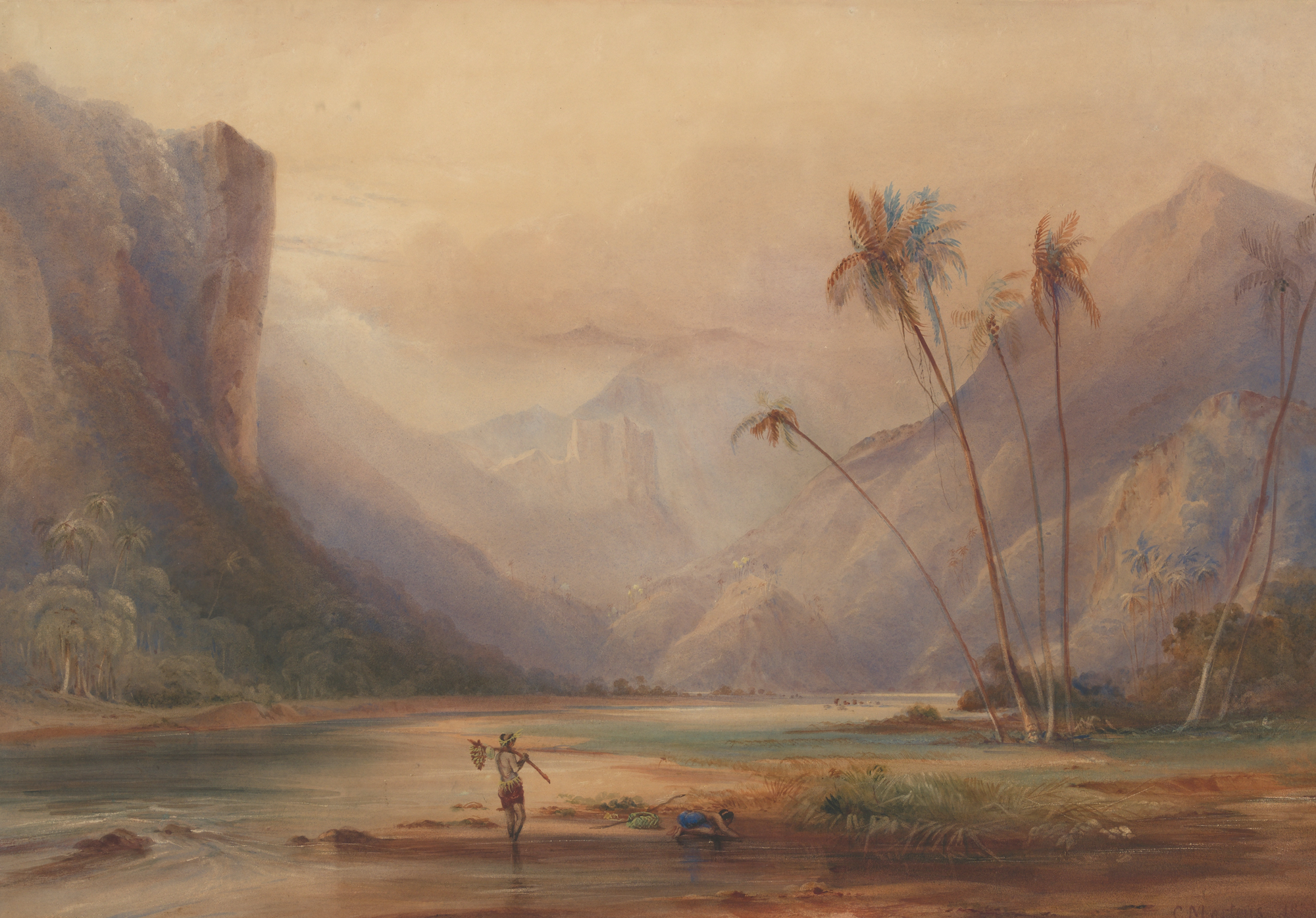 In 1835 Martens began sketching around the islands of Tahiti and Moorea. He was particularly inspired by the unfamiliar landscape with lush flora. It is thought that Martens paid one of the locals to ferry him between the two islands. Many of the sketches he produced on this trip progressed into later watercolours and and oil painting.