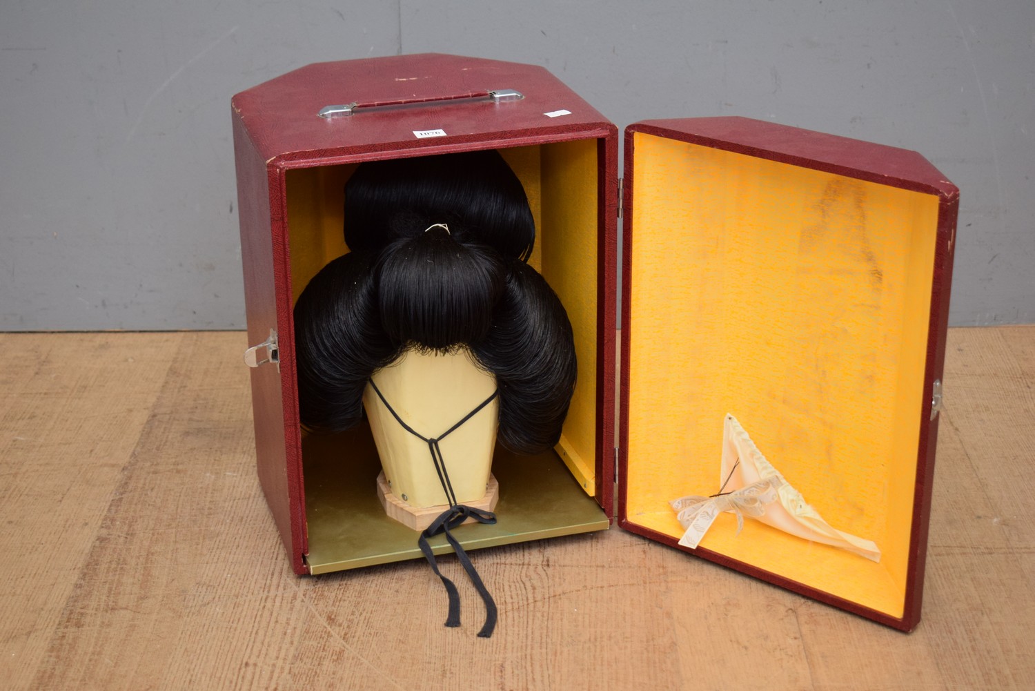 AN ORIGINAL 1940S JAPANESE GEISHA WIG IN RED BOX (40H X 37 W X 30D CM) (LEONARD JOEL DELIVERY SIZE:SMALL)