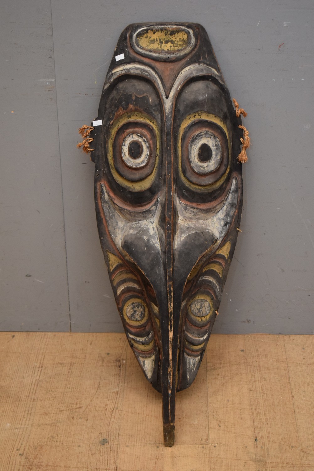 A LARGE 1940S NEW GUINEA NATURAL OCHRE PAINTED WOODEN MASK WITH LONG NOSE (H93 X W40 CM) (LEONARD JOEL DELIVERY SIZE: MEDIUM)