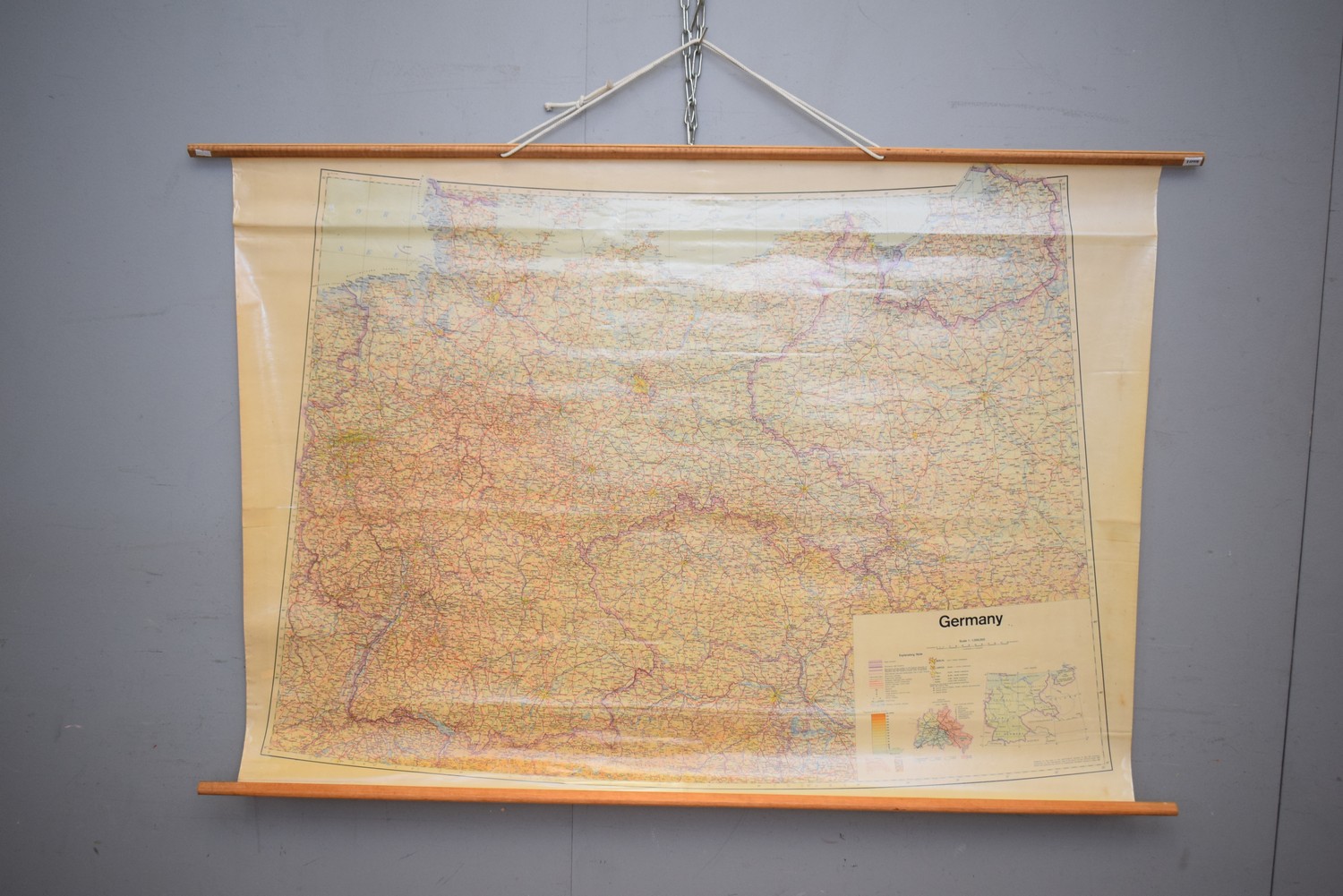 A LARGE PLASTIC COATED FABRIC 1950S WOODEN MOUNTED MAP OF GERMANY (100H X 150W CM) (LEONARD JOEL DELIVERY SIZE: SMALL)