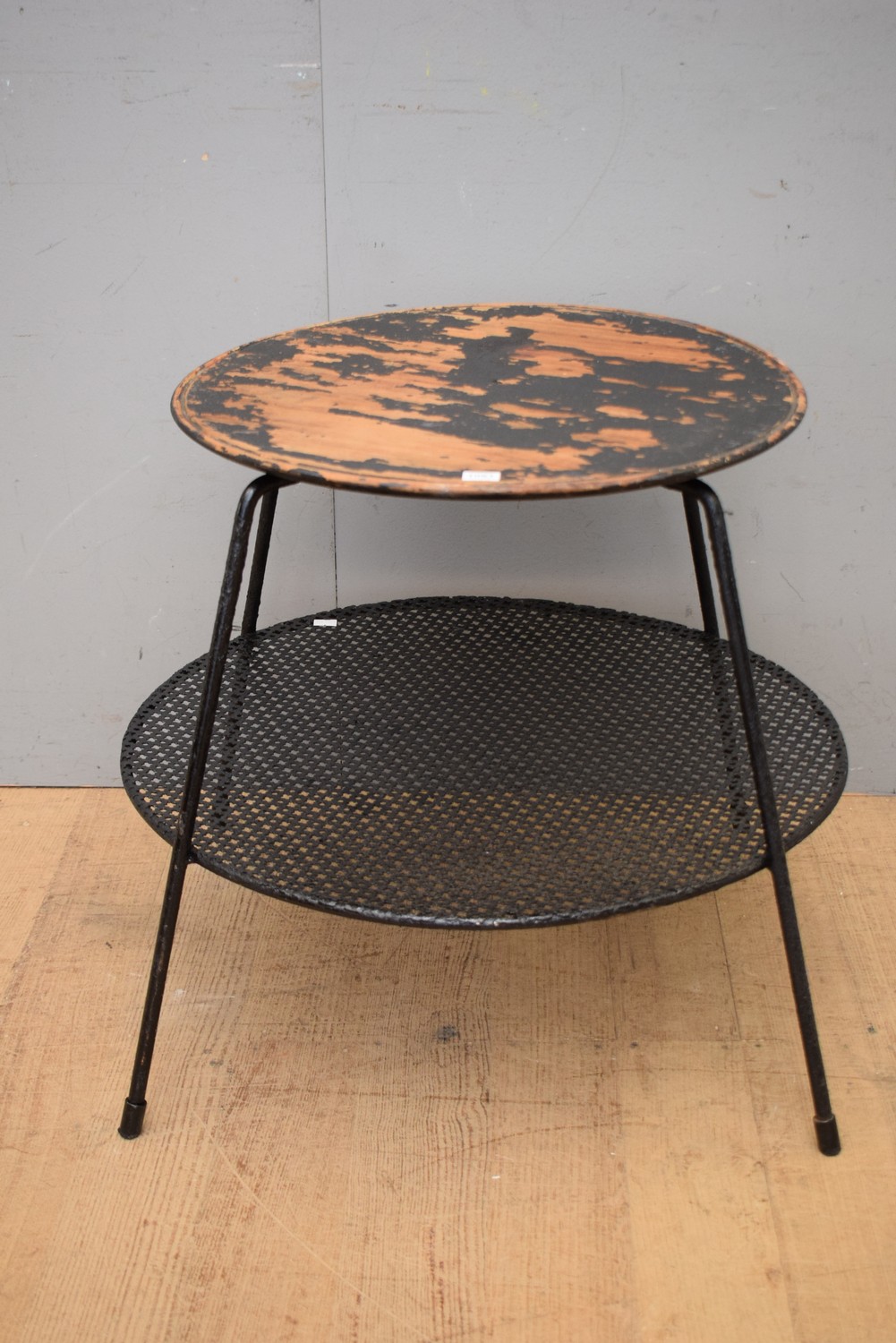 A 1920S FRENCH TWO TIER BLACK METAL AND WOODEN TOPPED TABLE (A/F) (55H X 62W CM) (LEONARD JOEL DELIVERY SIZE: SMALL)