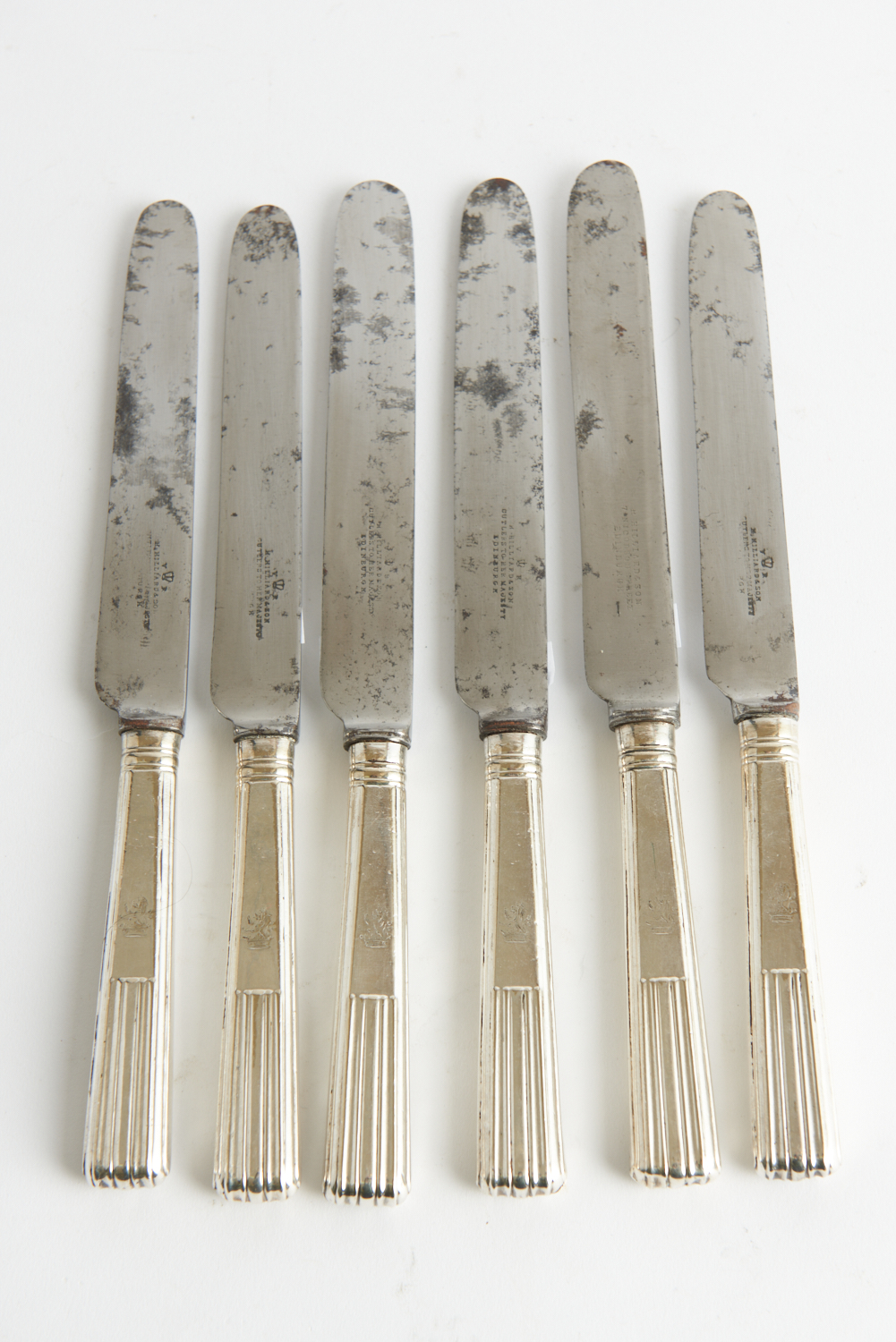 SIX GEORGIAN STERLING SILVER HANDLED TABLE KNIVES WITH ROYAL CREST ENGRAVED TO HANDLE, LEONARD JOEL LOCAL DELIVERY SIZE: SMALL