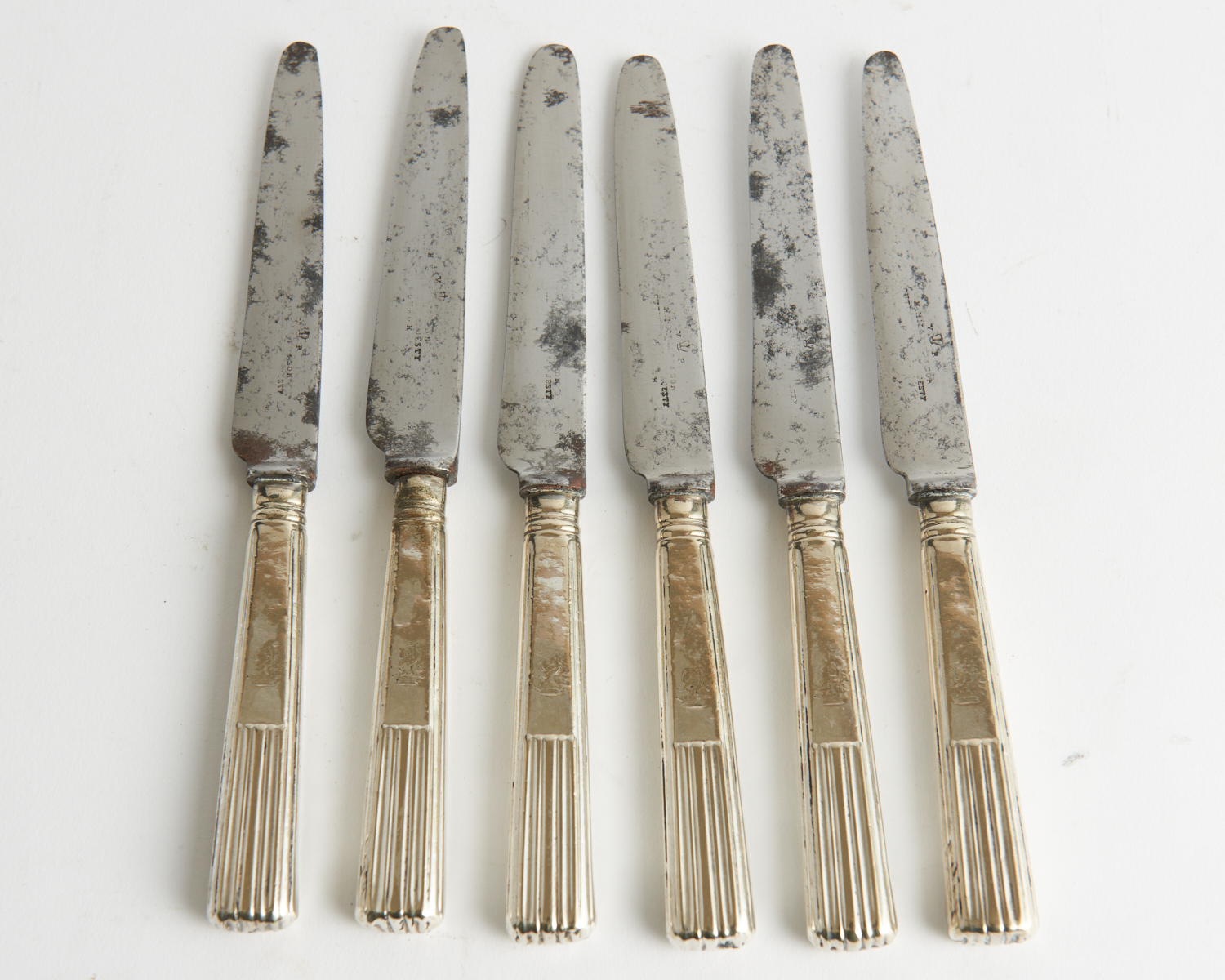 SIX GEORGIAN STERLING SILVER HANDLED ENTREE KNIVES WITH ROYAL CREST ENGRAVED TO HANDLE, LEONARD JOEL LOCAL DELIVERY SIZE: SMALL