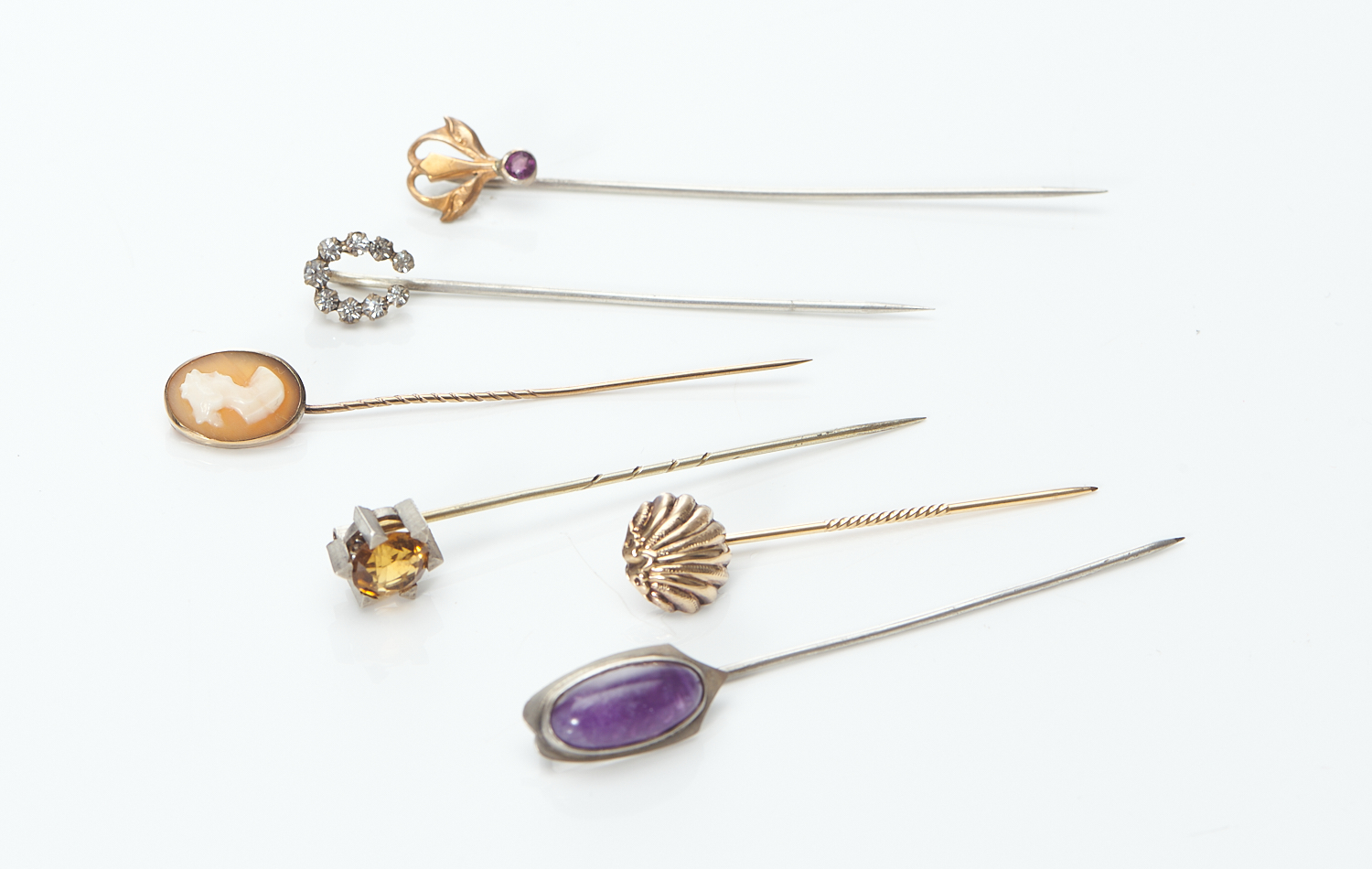 A COLLECTION OF SIX STICK PINS INCLUDING AMETHYST, CITRINE AND CAMEO SET IN GOLD AND SILVER