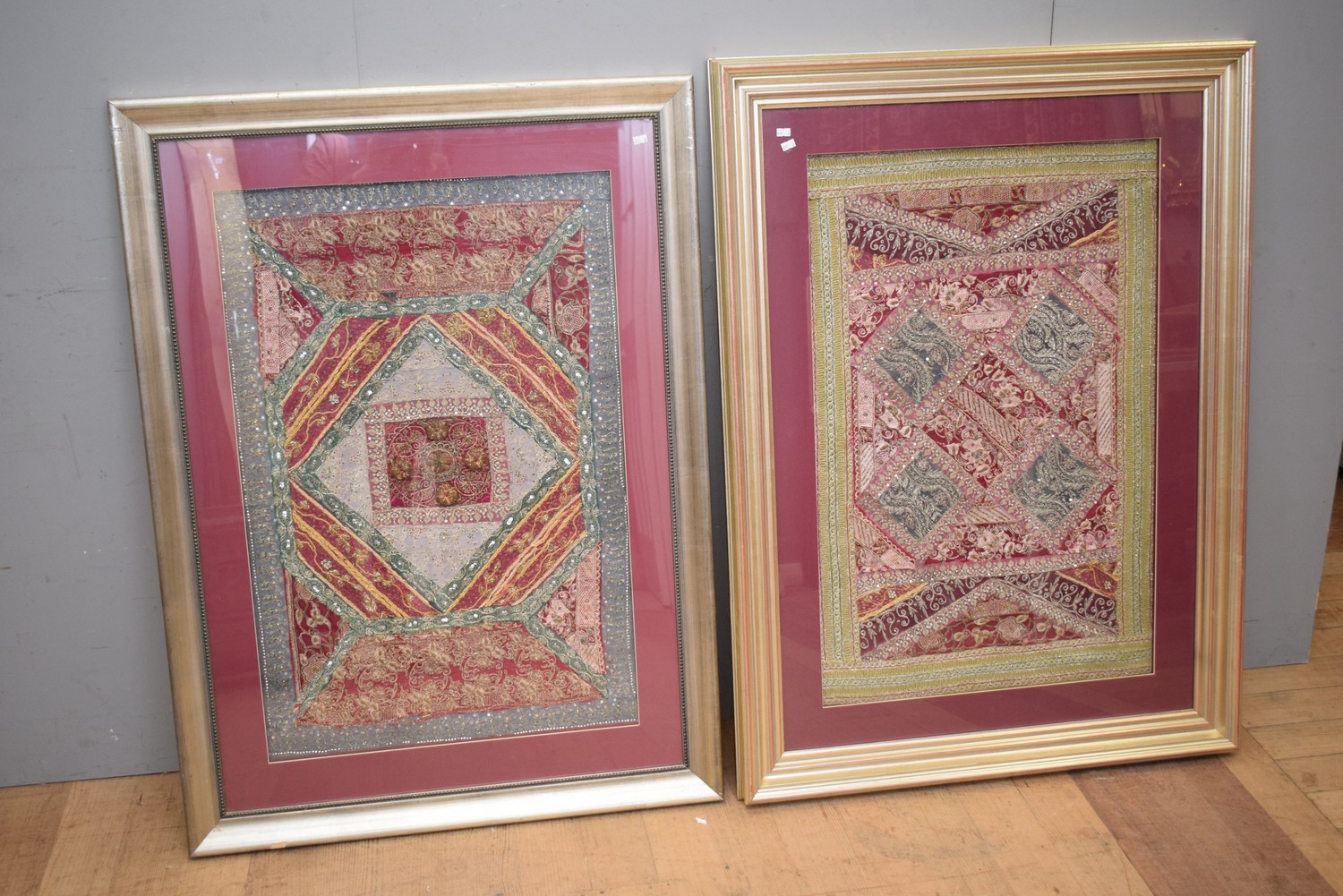 TWO FRAMED INDIAN EMBROIDERIES (123H X 89W CM) (LEONARD JOEL DELIVERY SIZE: MEDIUM)