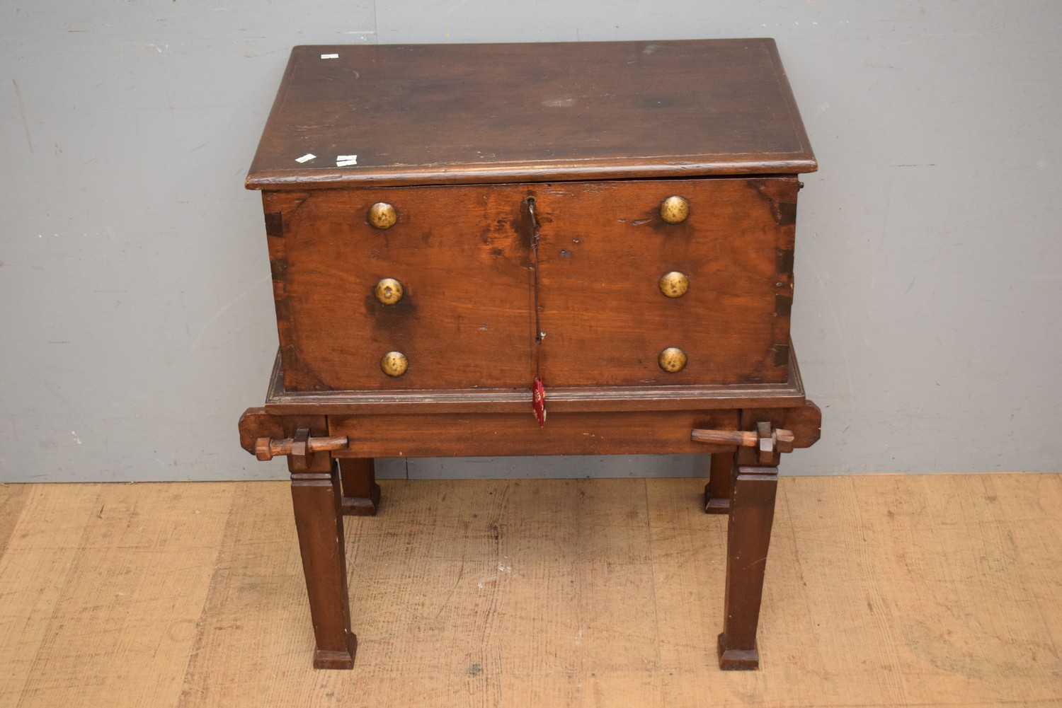 A RUSTIC TIMBER CHEST ON STAND WITH METAL HANDLES (75H x 78W x 42D CM) (LEONARD JOEL DELIVERY SIZE: MEDIUM)