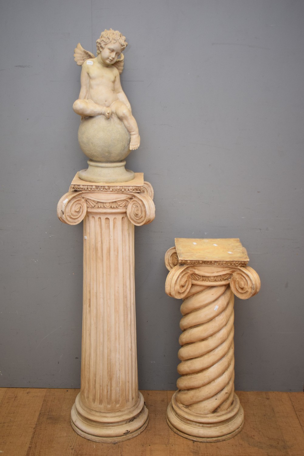 TWO COMPOSITE CLASSICAL STYLE COLUMNS AND A COMPOSITE CHERUB (A/F) (LARGEST 120H x 40W x 40D CM) (LEONARD JOEL DELIVERY SIZE: LARGE)