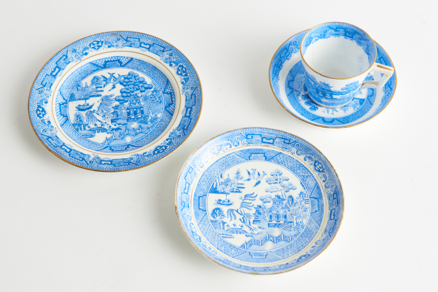 A MINTON BLUE AND WHITE FOUR PIECE TEA CUP AND SAUCERS (A/F), LEONARD JOEL LOCAL DELIVERY SIZE: SMALL
