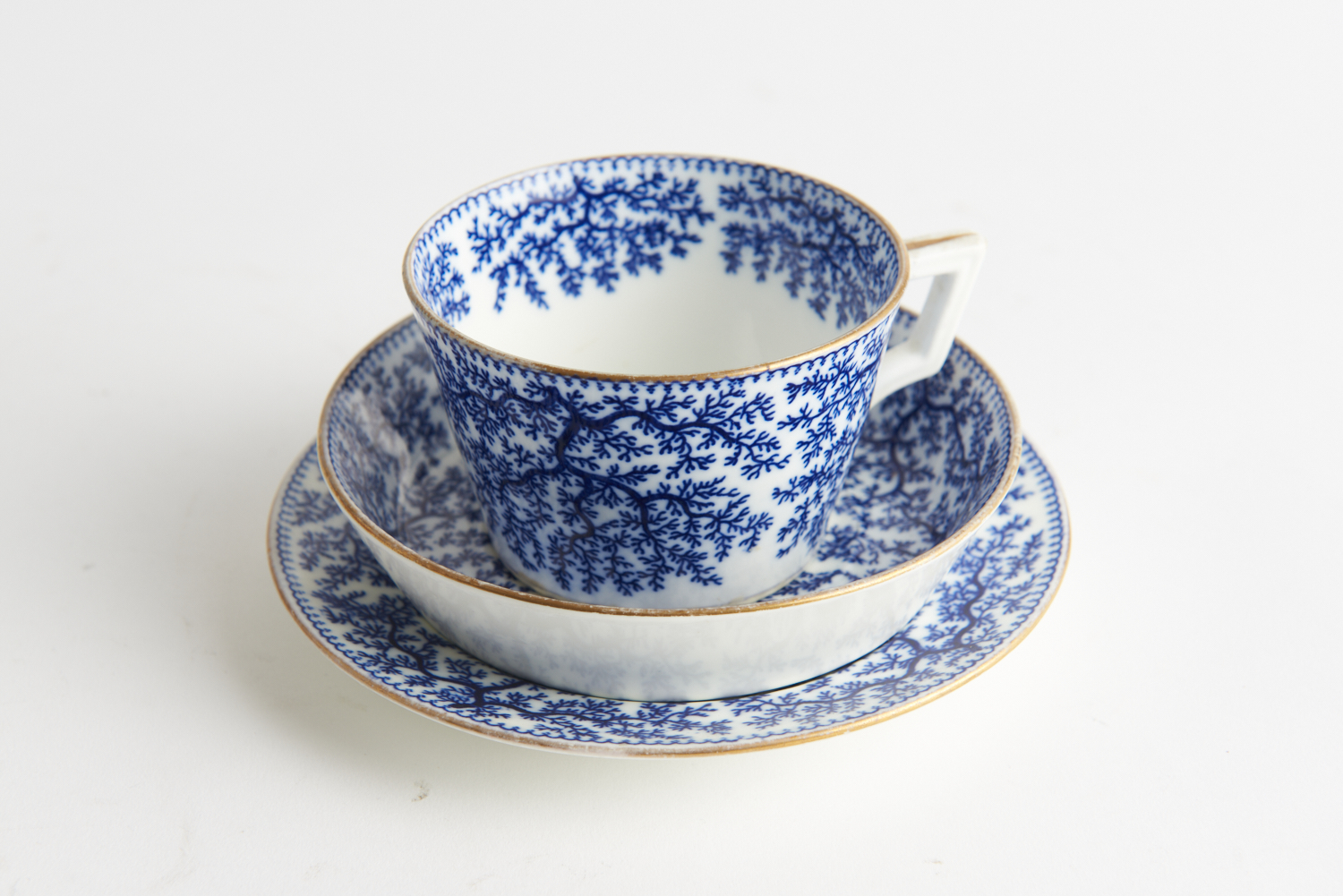 A MINTON BLUE SEAWEED PATTERN PORCELAIN TRIO (REPAIRED), LEONARD JOEL LOCAL DELIVERY SIZE: SMALL