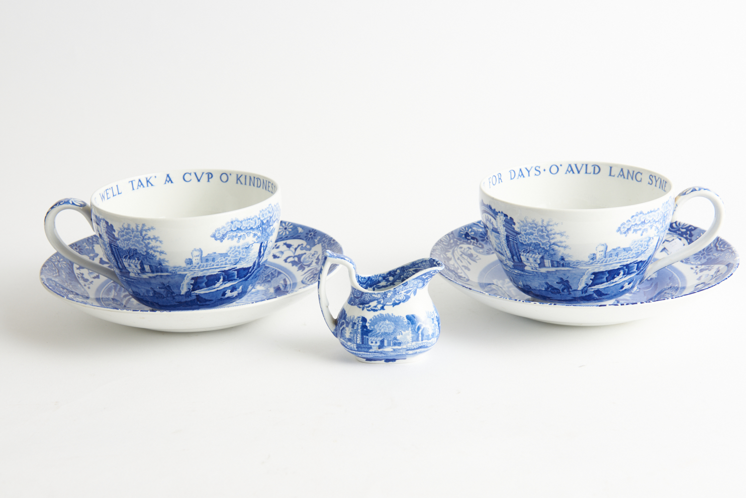 TWO SPODE BLUE ITALIAN BREAKFAST CUPS AND SAUCERS, TOGETHER WITH A MILK JUG, LEONARD JOEL LOCAL DELIVERY SIZE: SMALL