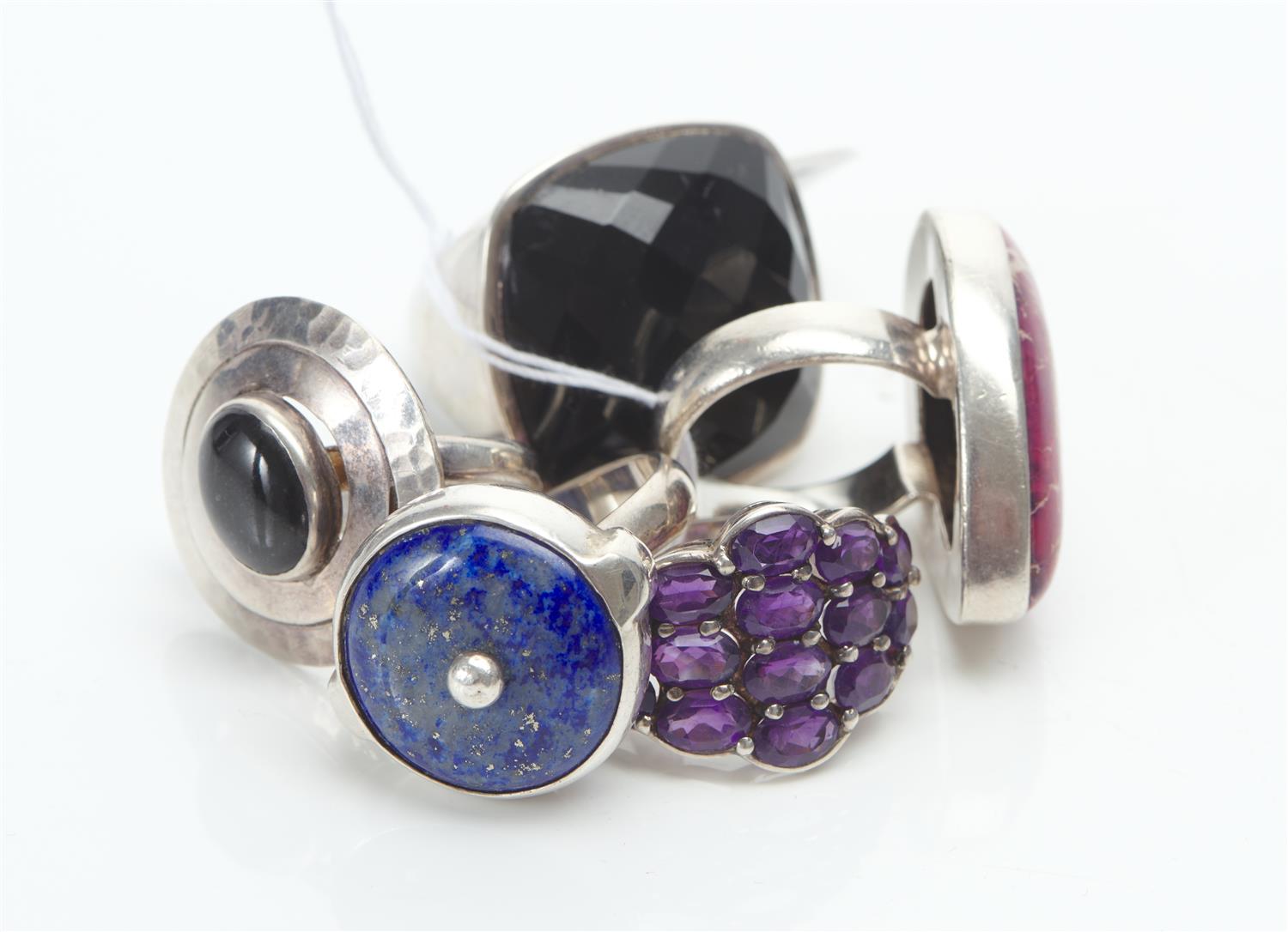A COLLECTION OF FIVE GEMSET RINGS IN STERLING SILVER, SIZES FROM M-O