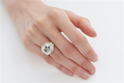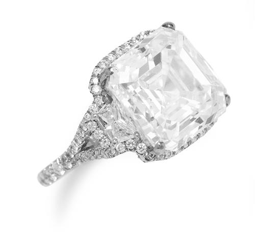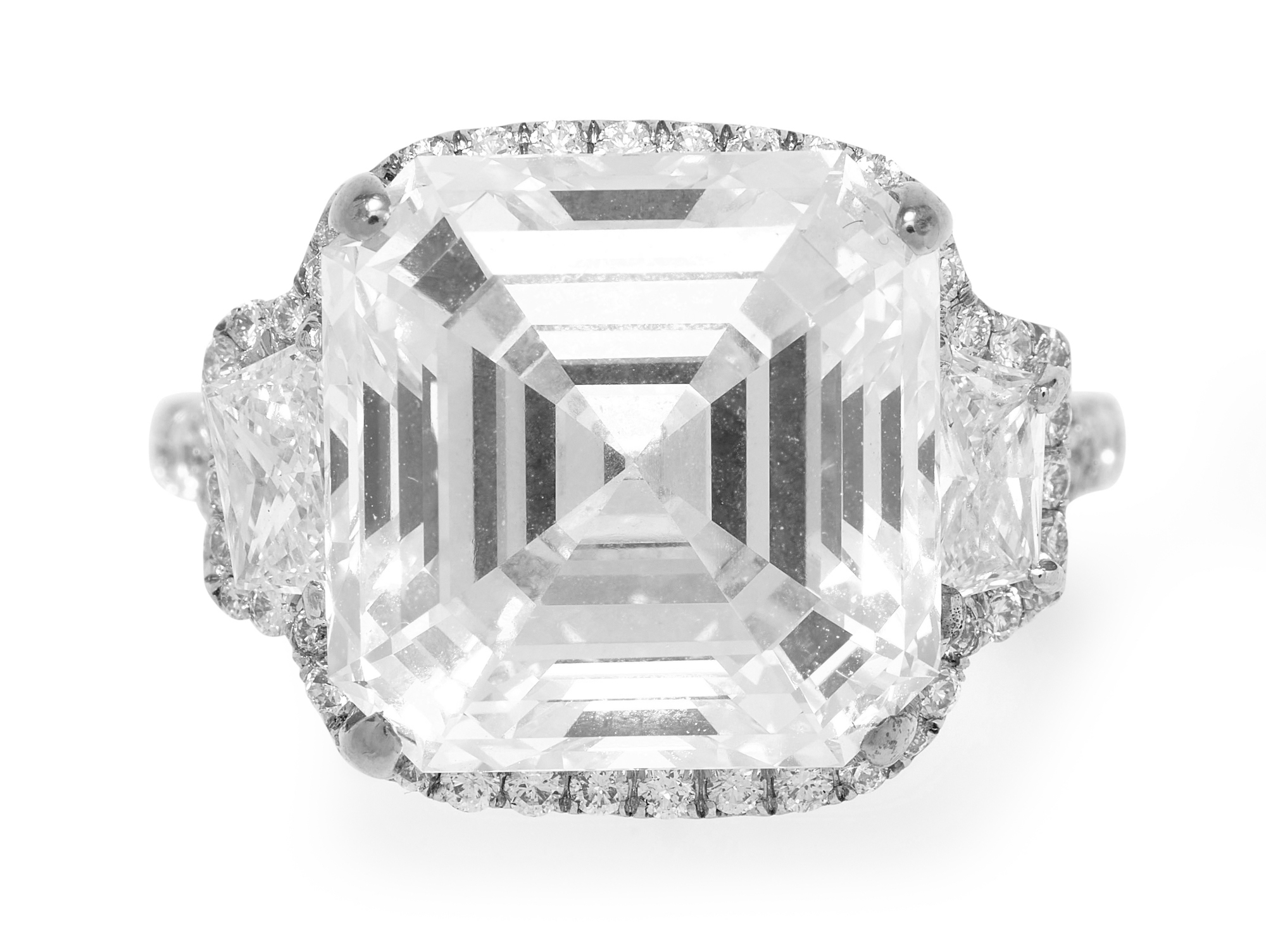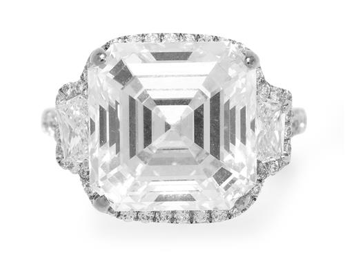 The square emerald-cut diamond weighing 11.00 carats is claw-set between trapeze-shaped diamonds, the edge and split shoulders pavé-set with brilliant-cut diamonds, size M.
