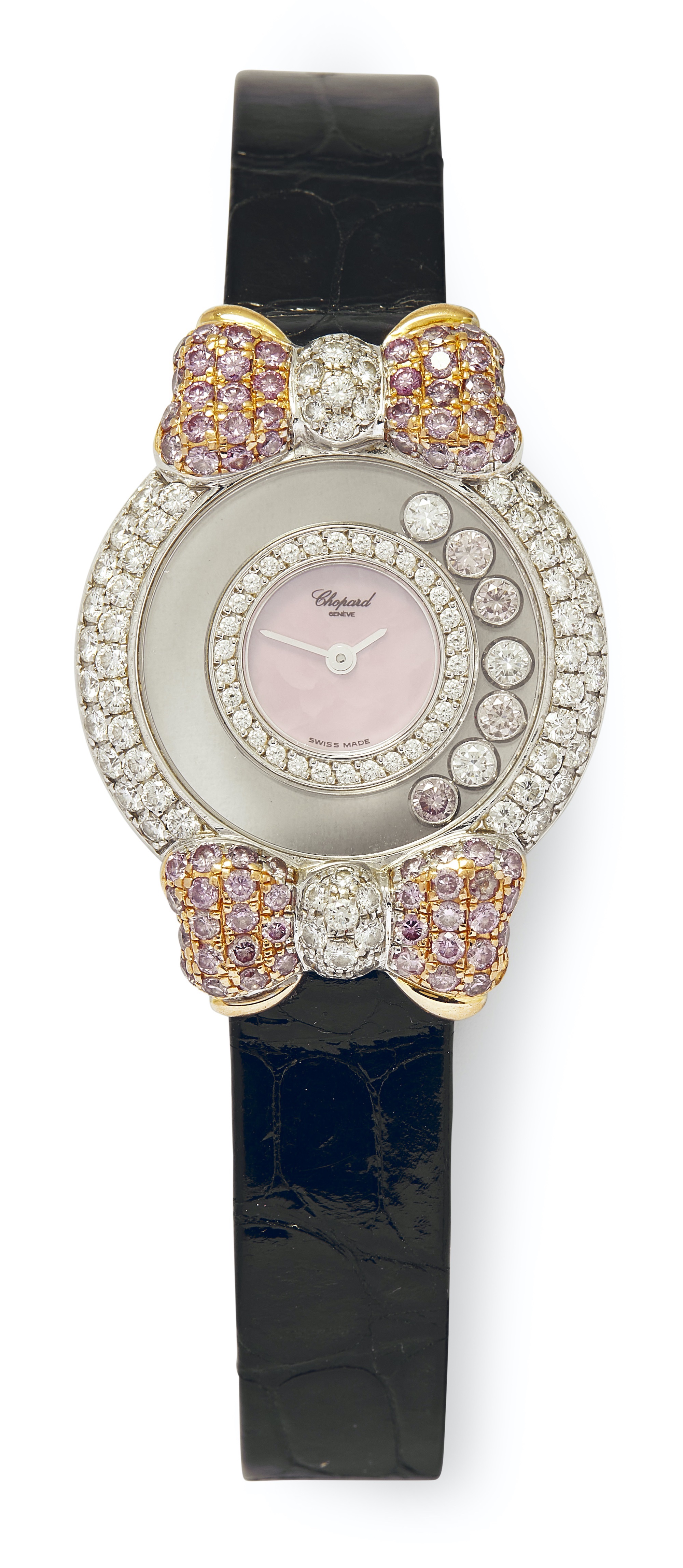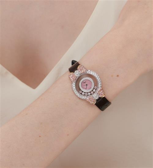 The lady's wristwatch is playfully decorated with two bows pavé-set with fancy pink and white brilliant-cut diamonds that sparkle and give an elegant lift to it's appearance.The dial is embellished with an eye-catching mother-of-pearl framed by a line of diamonds, the bezel pavé-set with diamonds between seven wandering pink and white diamonds, which really adds presence on the wrist.