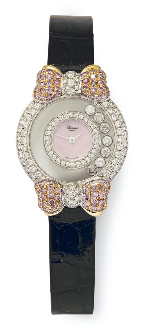 A RARE LADY'S 18CT PINK AND WHITE GOLD AND PINK AND WHITE DIAMOND SET 'HAPPY DIAMONDS - LA VIE EN ROSE' WRISTWATCH, CIRCA 1995