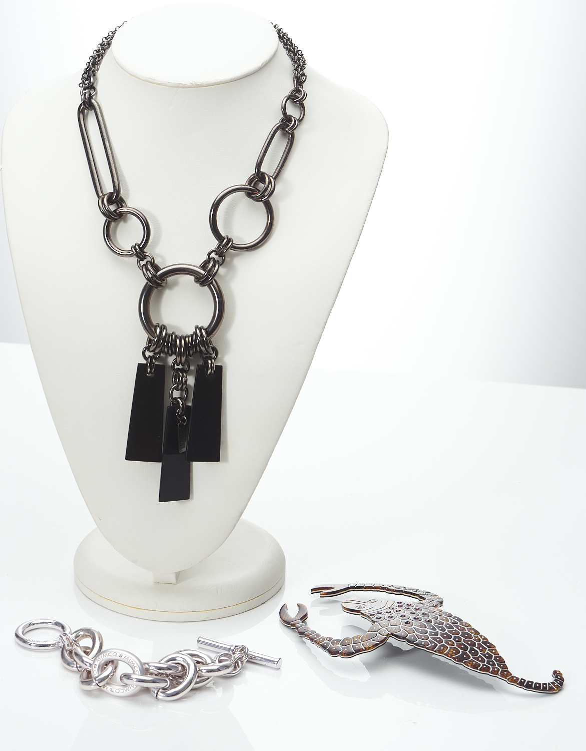 A COLLECTION OF COSTUME JEWELLERY INCLUDING MIMCO BRACELET AND BROOCH AND A MYSTICAL CREATURE BROOCH (A/F)