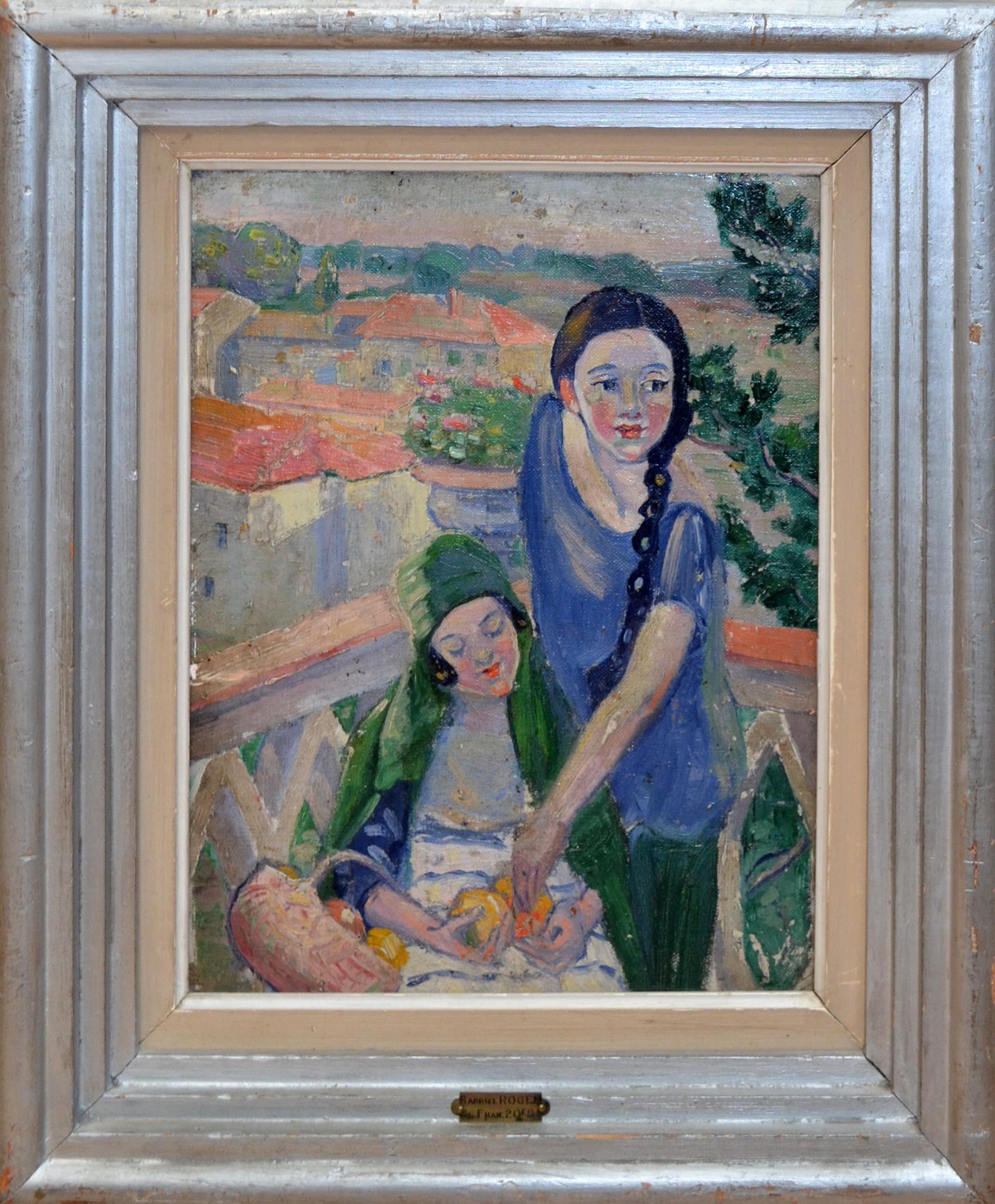 GABRIEL ROGER, TWO FIGURES, OIL ON BOARD, 34 X 26CM, FRAME SIZE: 49 X 40CM. CONDITION: PAINT LOSS TO THE UPPER EDGE OF THE ARTWORK, SURFACE DUST, LEONARD JOEL DELIVERY SIZE: SMALL