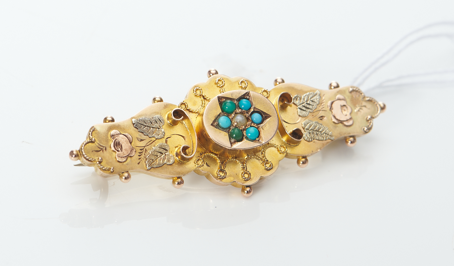 AN ANTIQUE SEED PEARL AND TURQUOISE BROOCH IN 9CT GOLD, WITH GLAZED REVERSE, HALLMARKED BIRMINGHAM 1898, 2.8GMS