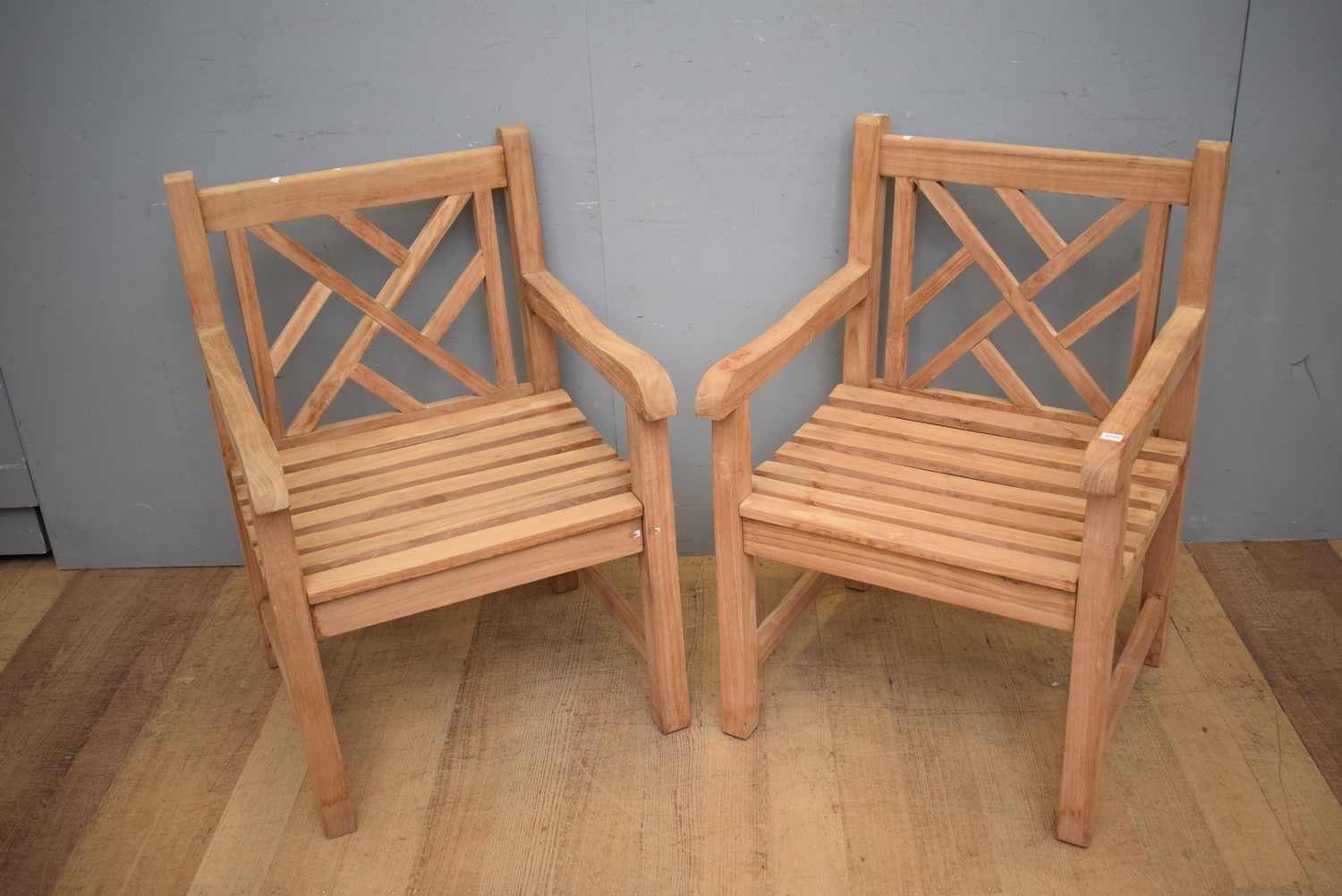 A PAIR OF TEAK CARVER CHAIRS (90H X 60W X64D CM) (LEONARD JOEL DELIVERY SIZE: LARGE)