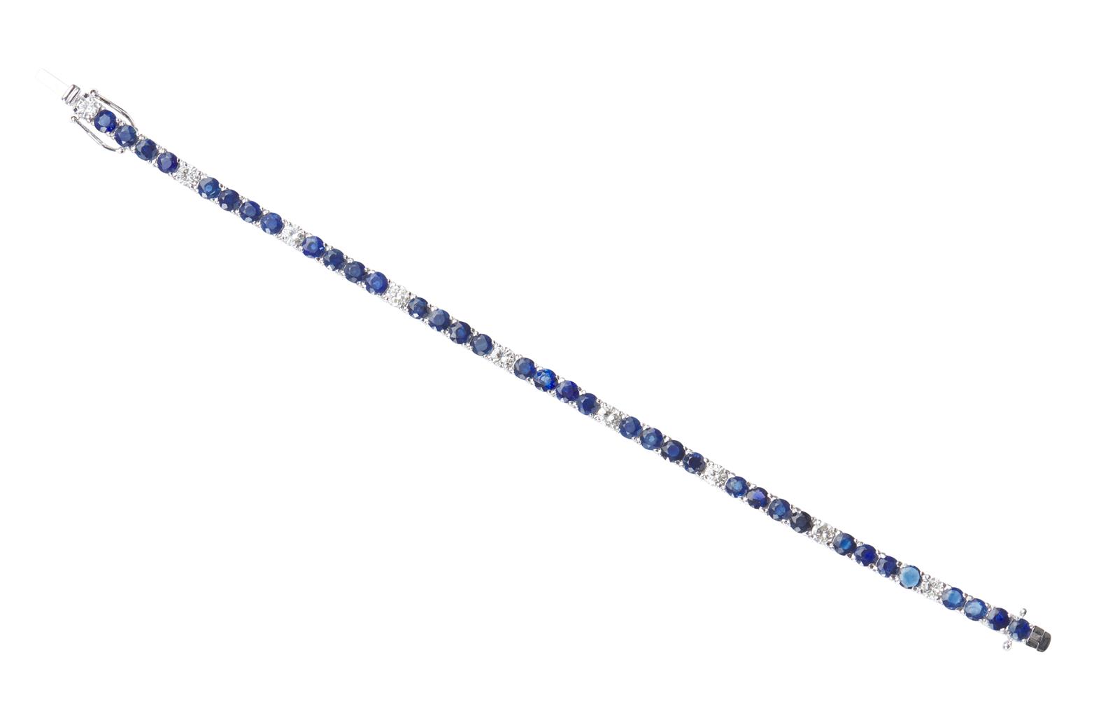 A SAPPHIRE AND DIAMOND LINE BRACELET Comprising thirty six sapphires totalling 12.80cts, spaced by nine round brilliant cut diamonds totalling 1.72cts, in 18ct white gold, total length 180mm.