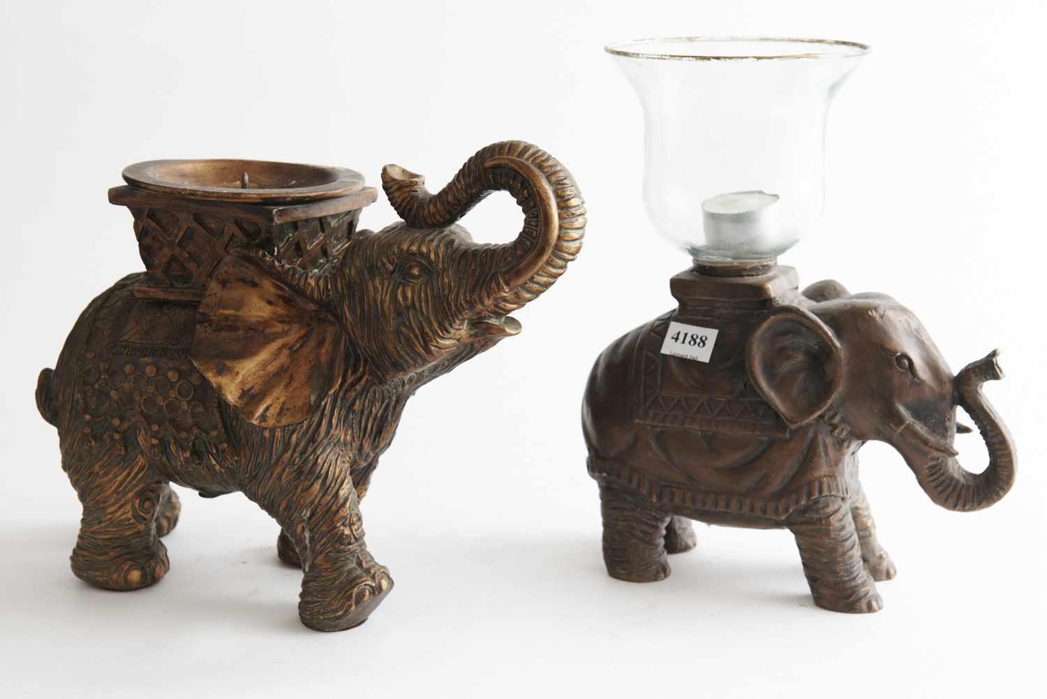 TWO ELEPHANT FORM PATINATED RESIN CANDLE HOLDERS, ONE WITH A HURRICANE SHADE, APPROX H.25CM, LEONARD JOEL LOCAL DELIVERY SIZE: SMALL