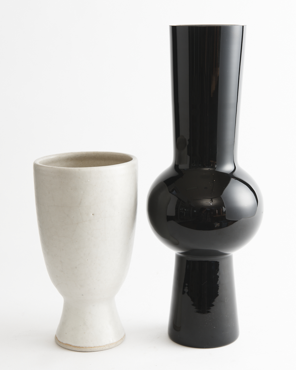 AN IVAN ENGLAND CERAMIC VESSEL WITH MONOGRAM (21 CM H) AND A MODERNIST GLASS VASE (36 CM H), LEONARD JOEL LOCAL DELIVERY SIZE: SMALL