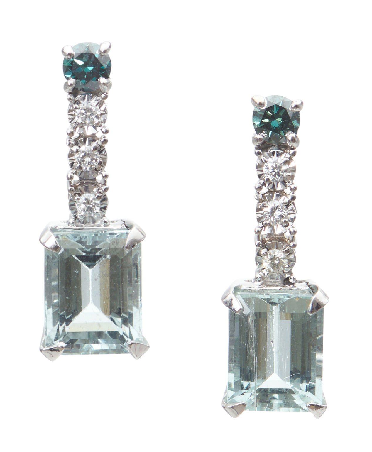 A PAIR OF AQUAMARINE, BLUE DIAMOND AND DIAMOND EARRINGS